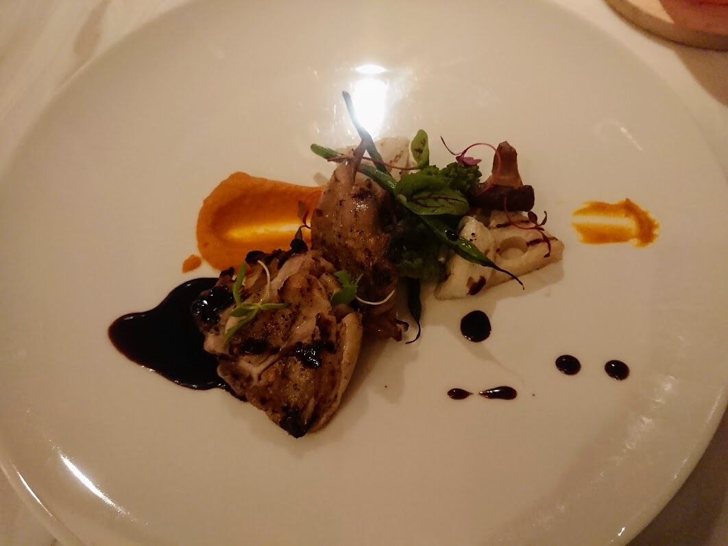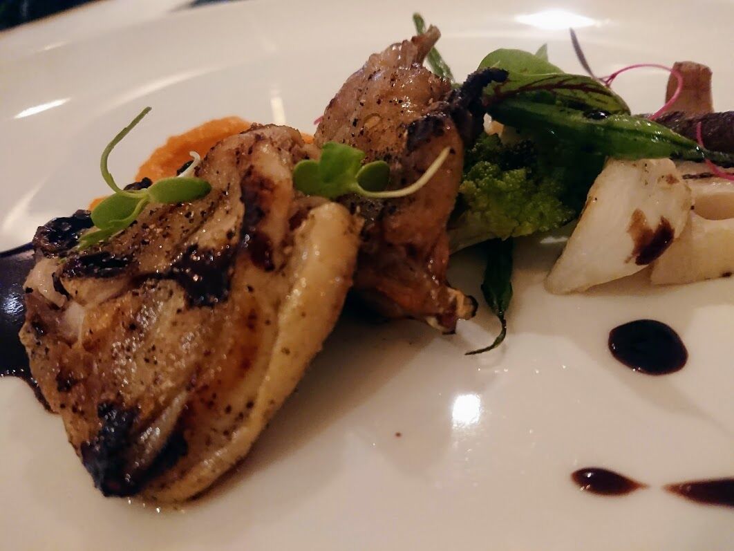 ウズラのグリル 人参のピューレと季節の野菜添え バルサミコソース