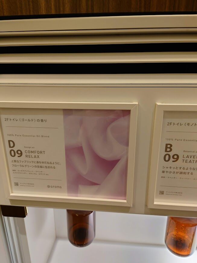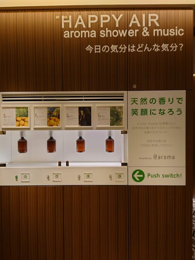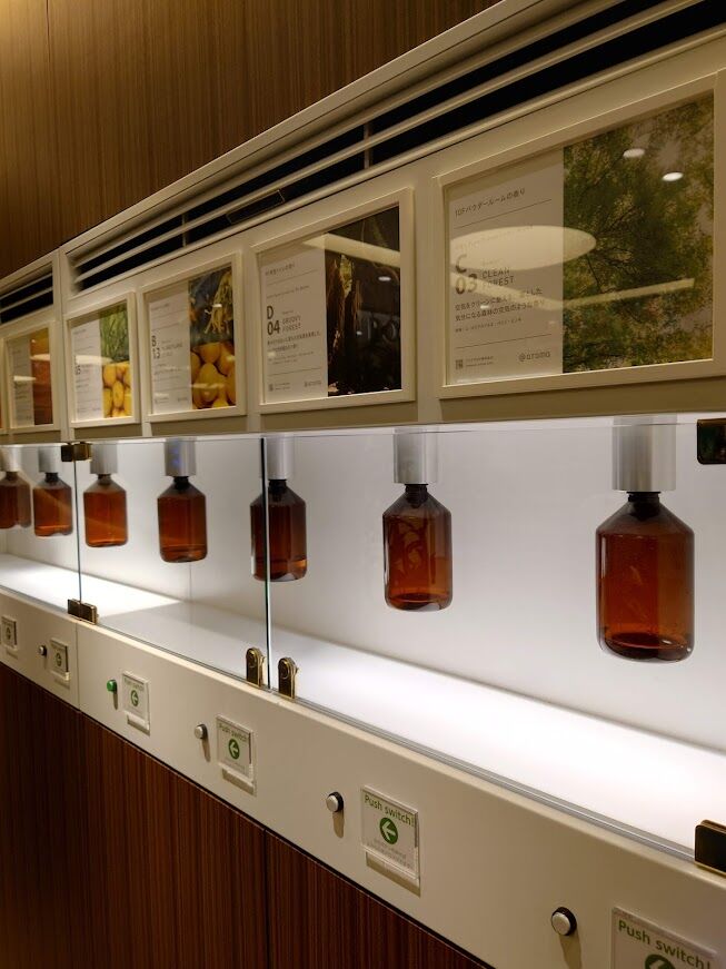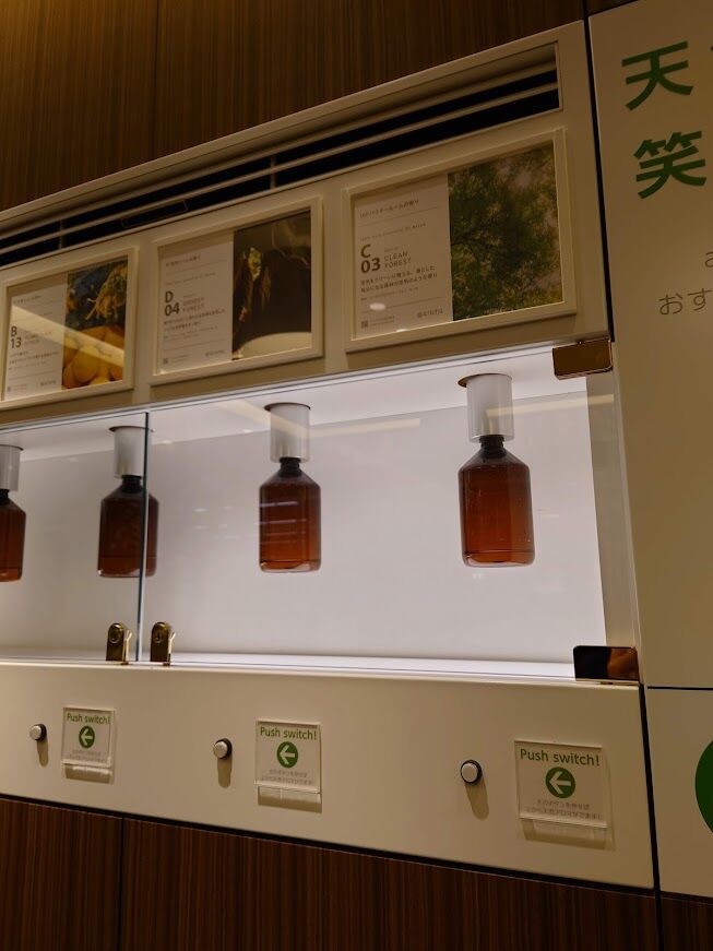 瓶が下がっている下のボタンを押すと、その香りが上から降ってくるのです。