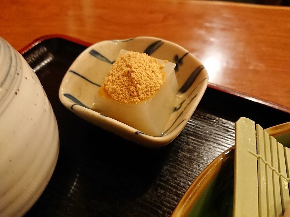 塩が効いたきな粉のかかった蕎麦で作ったわらび餅。すっごいトロントロン。