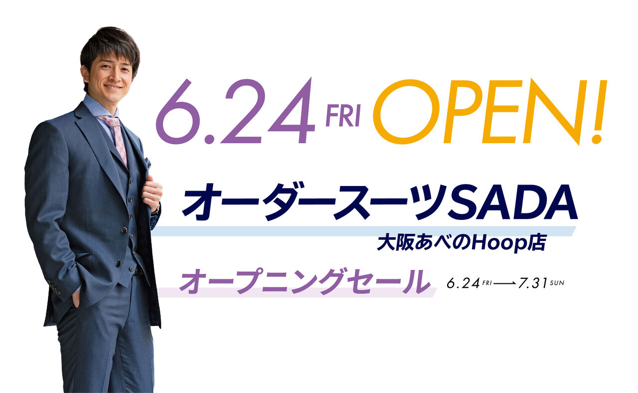 初回19,800円(税込21,780円)~オーダースーツを提供する株式会社オーダースーツSADA(本社:東京都千代田区、代表取締役社長:佐田展隆)は、「大阪あべのHoop店」を2022年6月24日(金)にオープンいたします。また、オープンを記念して、オープニングセールを開催いたします。