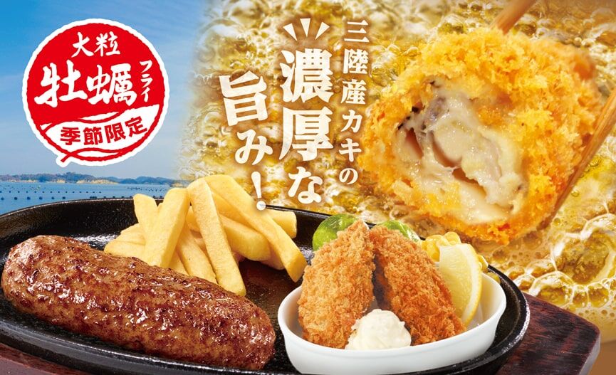 昨年大好評だった、濃厚でクリーミーな三陸産『大粒牡蠣フライ』を、季節限定で今年もご用意いたしました。三陸は牡蠣の名産地で、豊かな漁場により身が大きく、味も濃く甘みのある牡蠣が育ちます。その中でも大粒のものを厳選し、フライにいたしました。サクッ・ぷりっ・ジューシーな『大粒牡蠣フライ』を、ステーキやハンバーグとのセットメニューや、おつまみとして単品でもお楽しみください。