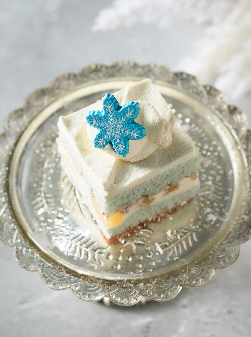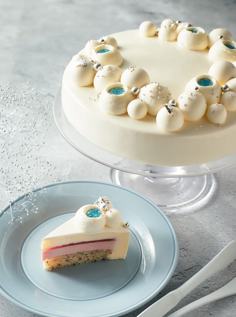 シルバーやブルーを基調とした宝石や、雪の結晶がキラキラと輝く白銀の世界を連想させるスイーツが登場。ブルーキュラソーやホワイトチョコを使用したフォトジェニックで美しいスイーツ全26種と、フード全19種をご用意します。宝石や雪の結晶をちりばめ、ティアラをイメージした「ベリーとバニラのムース」は、バニラ風味のクリームと甘酸っぱいベリームースのマリアージュを楽しむ大人なスイーツです。 「ブルーベリーマカロン」は、ブルーベリー風味のバタークリームを、ブルーやホワイトカラーのマカロンで挟み込みました。表面には粉末のチョコレートをあしらい、見た目も華やかなスイーツに仕上がりました。