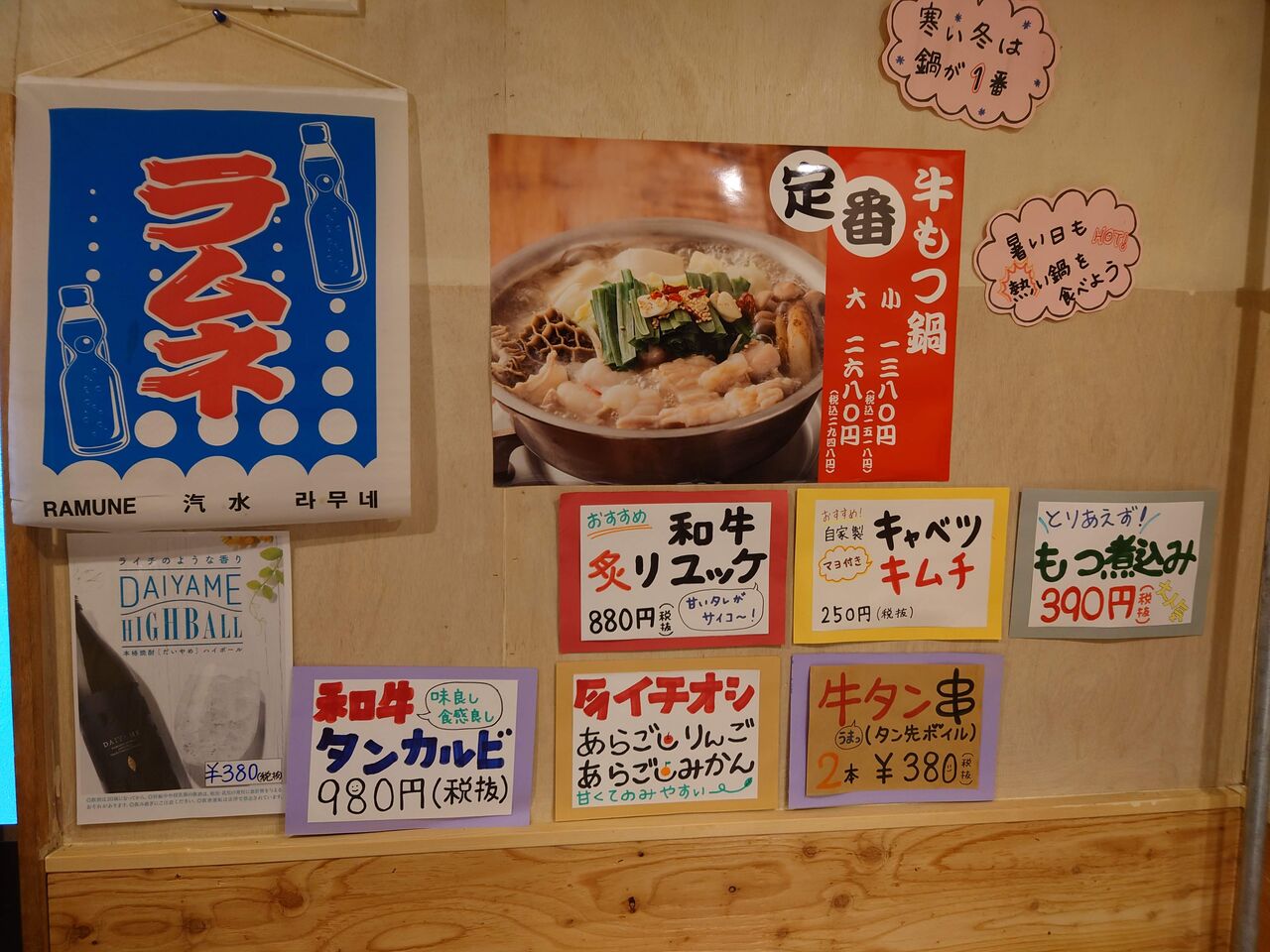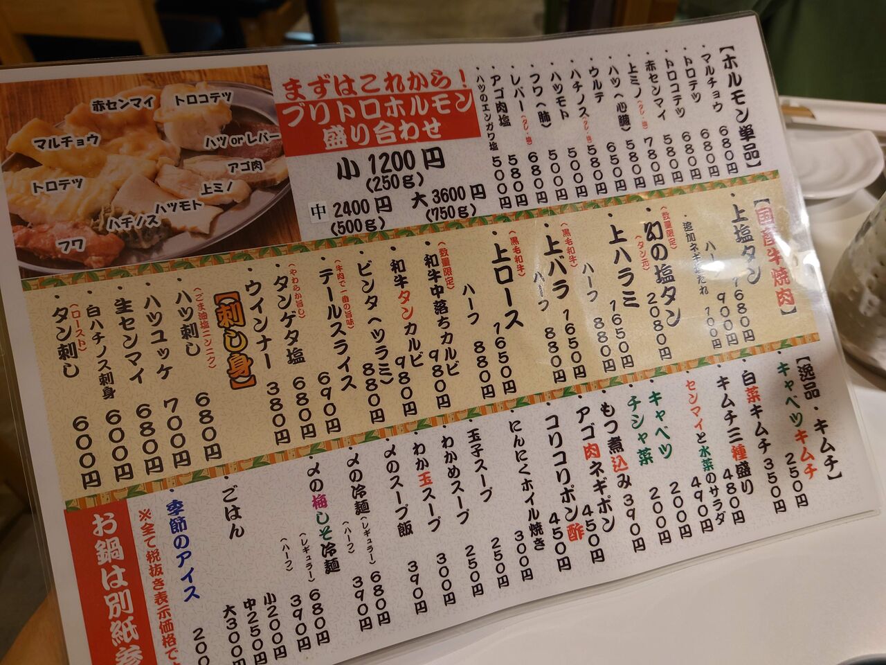 店頭の提灯には「国産牛内臓専門店」と書いてあり、ホルモンのお店なのですが、ホルモンが苦手な人も大丈夫でした。というのも、お店のホームページでメニューを見ると、タンやハラミやバラ、ロースなど、家で焼き肉をする時に普通に食べる部位が載っていたのでいけるのでは?と思い、連れて行ったら大丈夫だったのです。