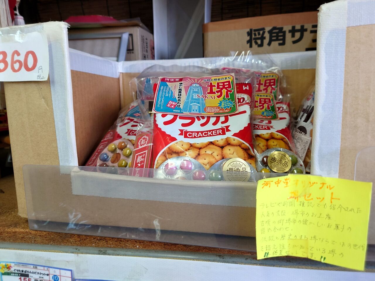 大袋のお菓子などもたくさん扱われていて魅力的なのですが、実はお目当ては他にありました。前回、購入目的で訪れたところ、すでに売り切れだったので手に入らなかった堺のお菓子セットなのです。