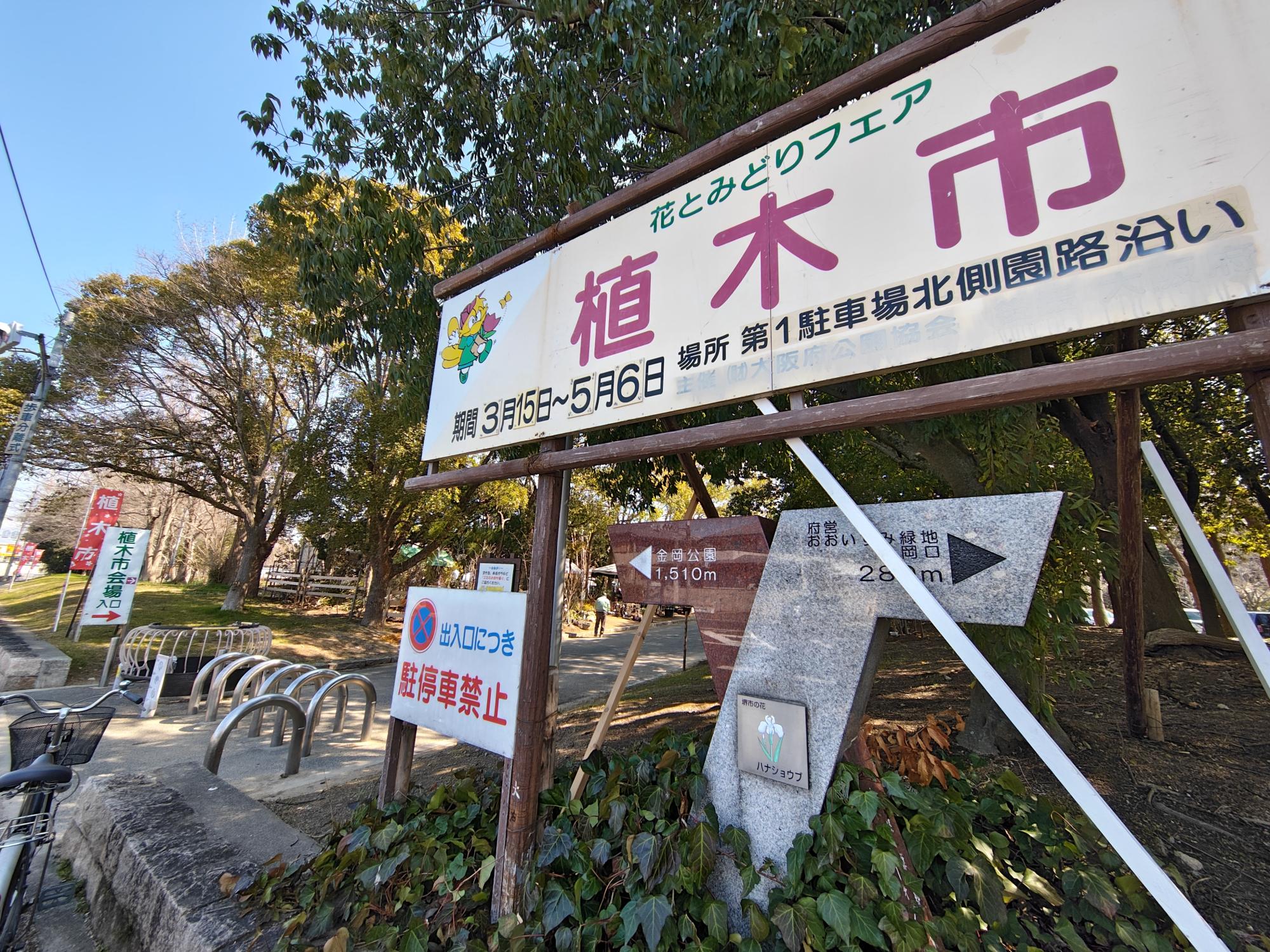 この時期恒例のお楽しみ! 堺市北区金岡町の府営大泉緑地にて、「花とみどりフェア 植木市」が行われています。「2025年3月15日(土)〜5月6日(火)」と、期間の書かれた大きな看板が出ているのは、大泉緑地西側の第一駐車場の北側の出入口です。植木市の場所もこちらの出入口が一番近いです。