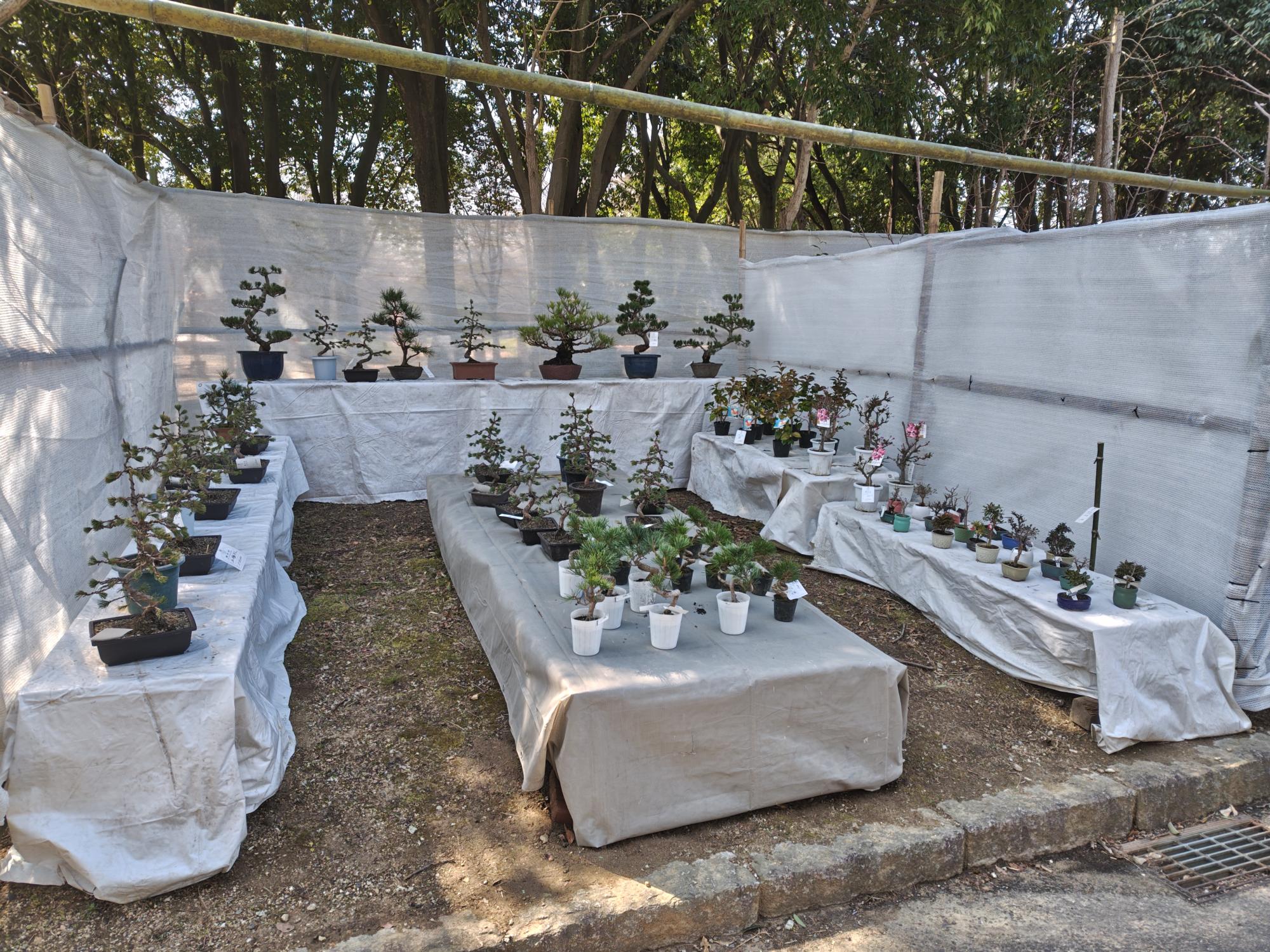 出入口からもう少し奥に進むと、盆栽が並んでいるコーナーもありました。色々な枝ぶりのものがあり、見ごたえがあります。「花とみどりフェア 植木市」は、期間がゴールデンウィーク終了までと、長めなのでじっくり見て選ぶことができそうですね。期間中の土・日曜日は、チップたい肥の無料配布もされているそうですよ。