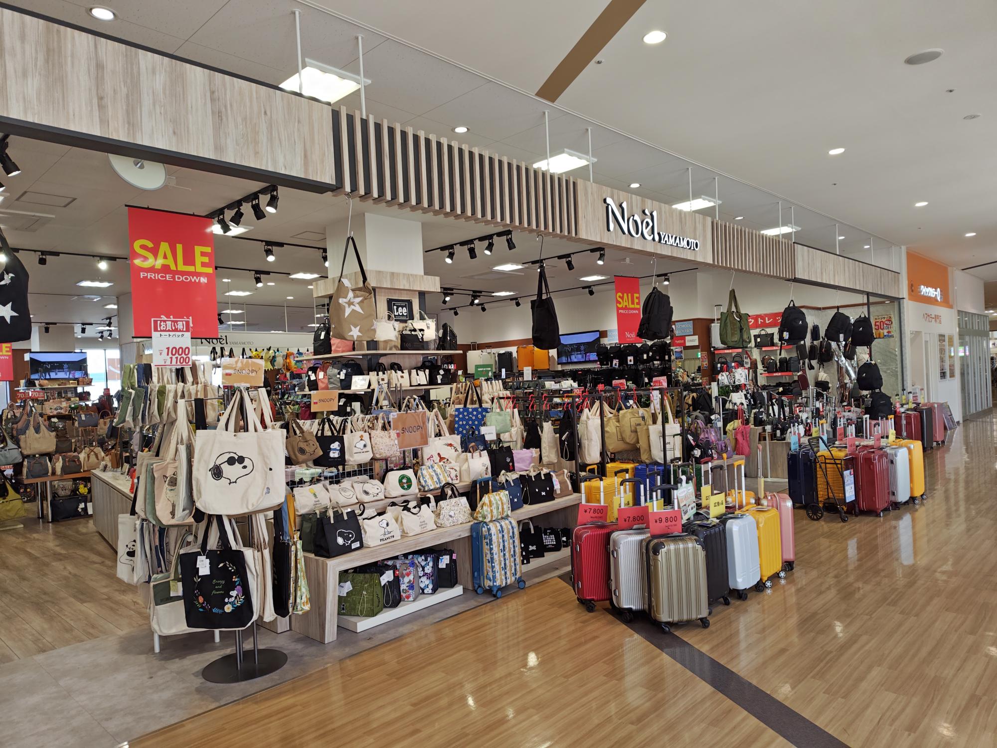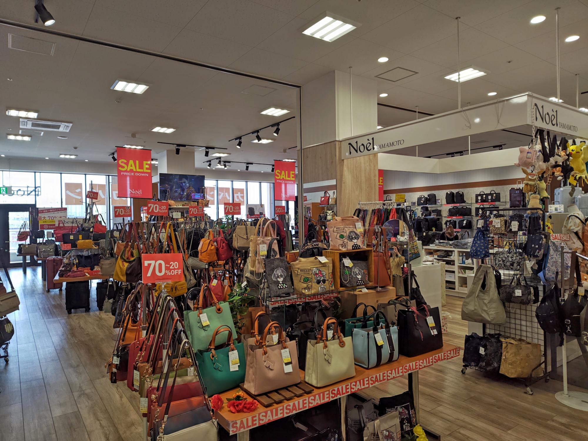 「Noel yamamoto 美原店」さんもとても広くて、地域最大級の売り場を誇ります。バッグだけではなく、お財布などもたくさん販売されています。