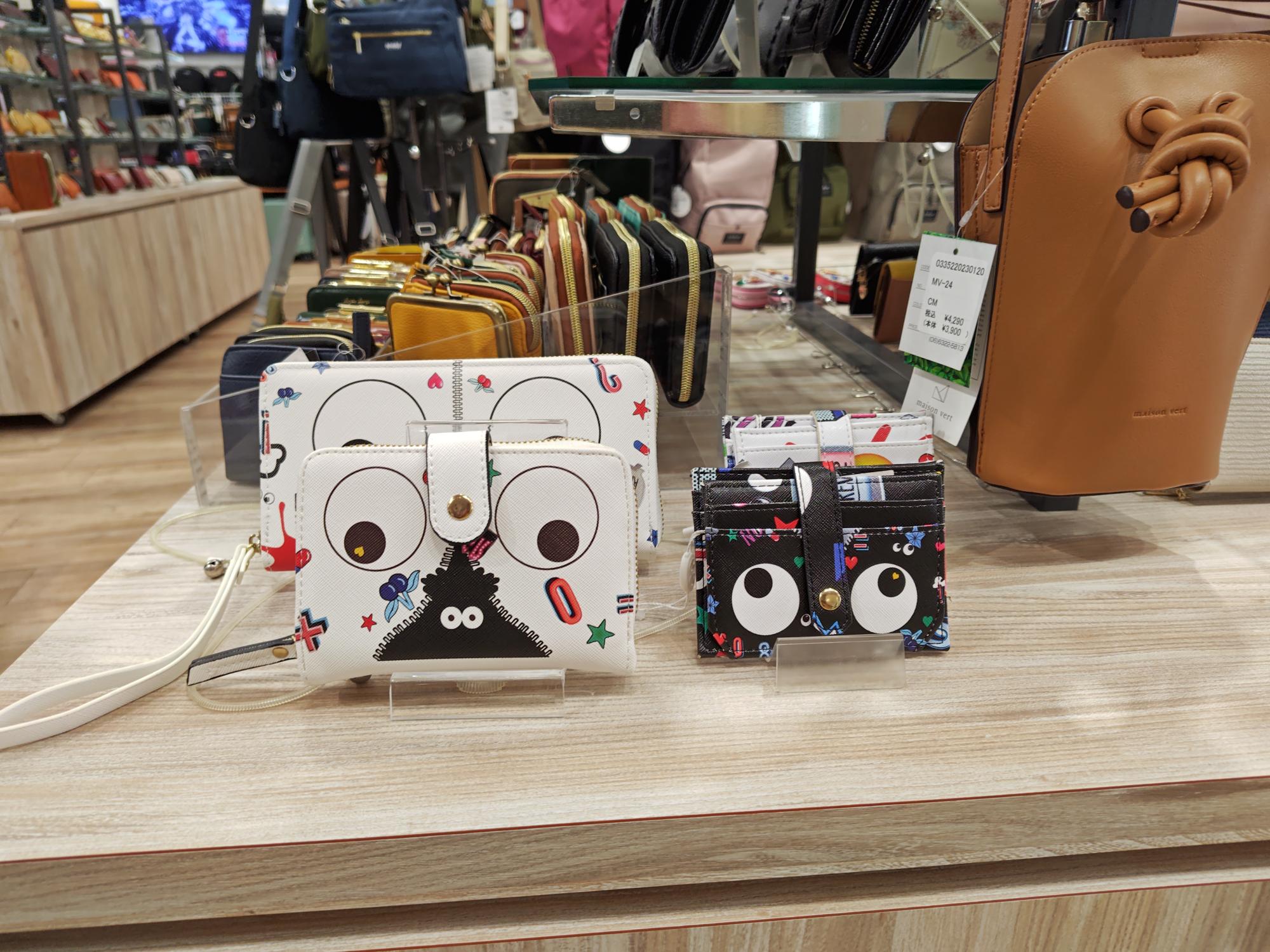 お財布も、シックなものからカラフルなもの、可愛らしいもの、奇抜なデザインのものなどたくさんあって、見ているだけでも楽しいです。長財布もあれば、三つ折り財布もあり、小銭入れ、パスケースなども。写真はほんの一部です。