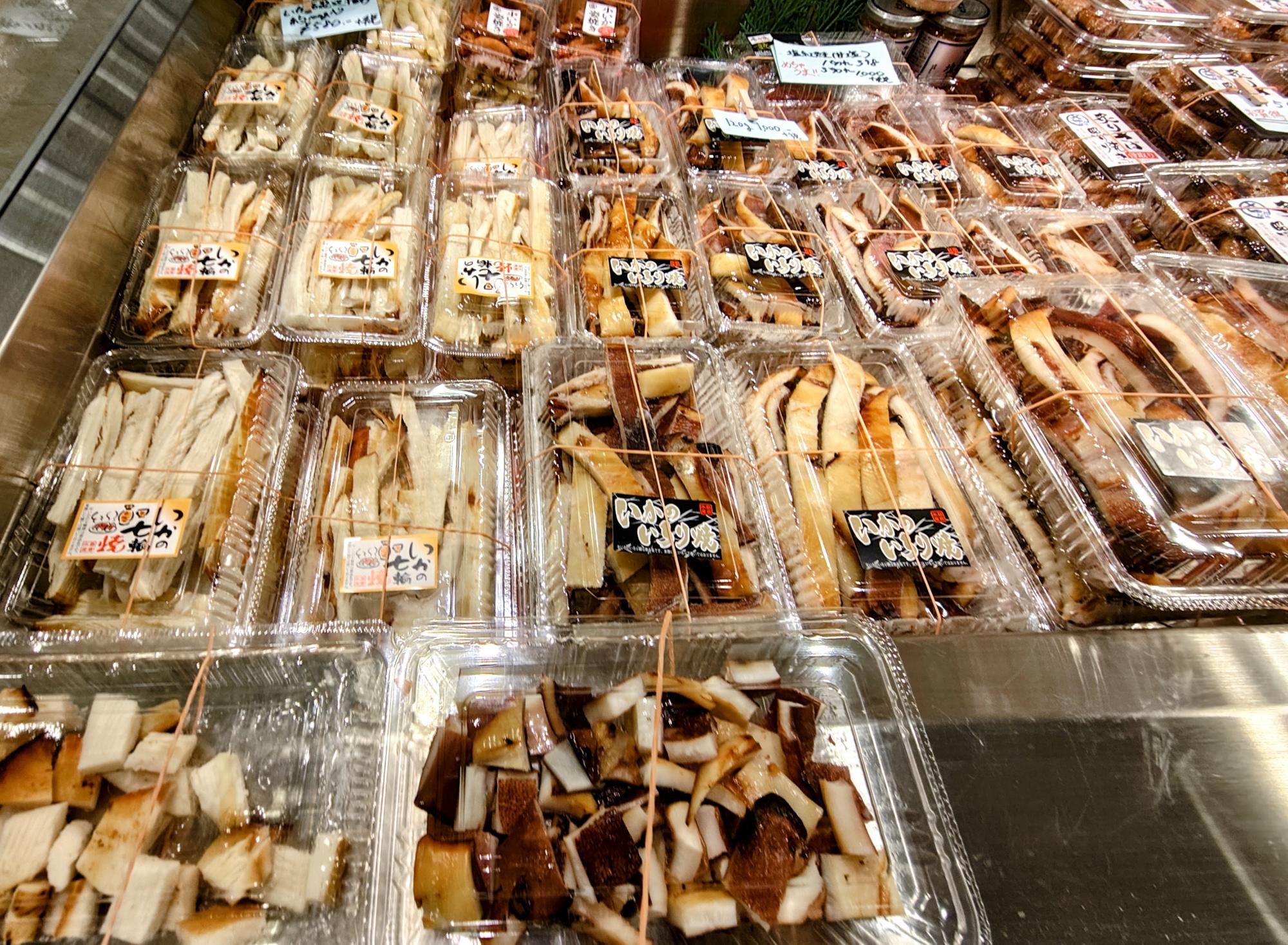 最初に気になった「いかの七輪焼」と「いかのいろり焼」も試食させていただけ、やはり美味しい。子持ちししゃもも、焼いて輪切りにした一口サイズのものを食べさせてもらえ、塩味も醤油漬けも美味しくて、どんどん迷いが出てしまいました。ほぼすべての商品の試食が用意されているようでした。