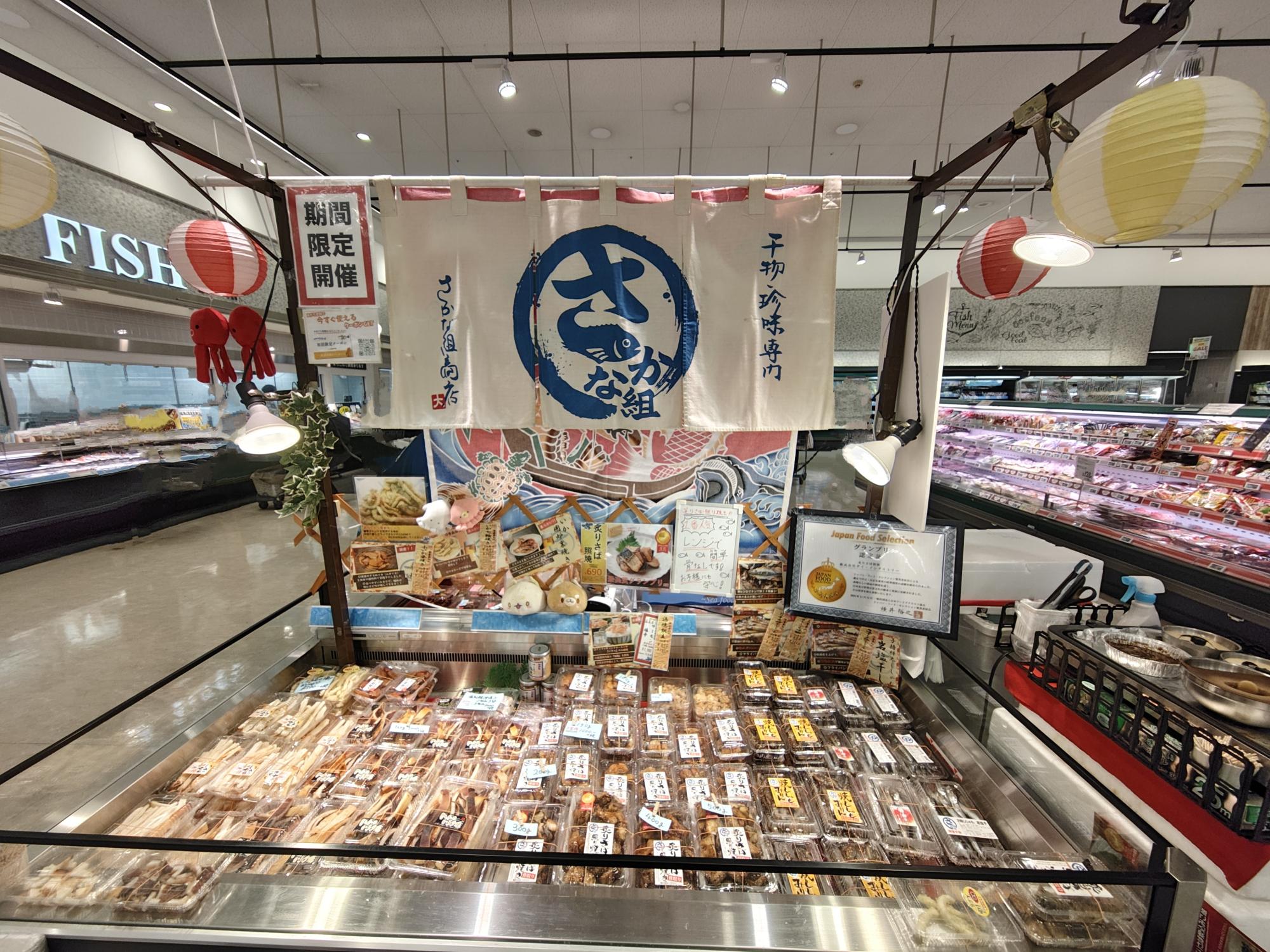 「さかな組商店」さんは、干物や珍味を専門に、全国のスーパー店内にて期間限定出店しているお店ですが、イオン堺北花田店では先日、2025年4月26日(土)~4月28日(月)の期間限定で出店していました。場所はイオン堺北花田店1Fの食品 日用雑貨のフロアの北端、鮮魚コーナーです。イオンモールからだと、ウェルカムコートがある10モール出入口から一番遠いところです。