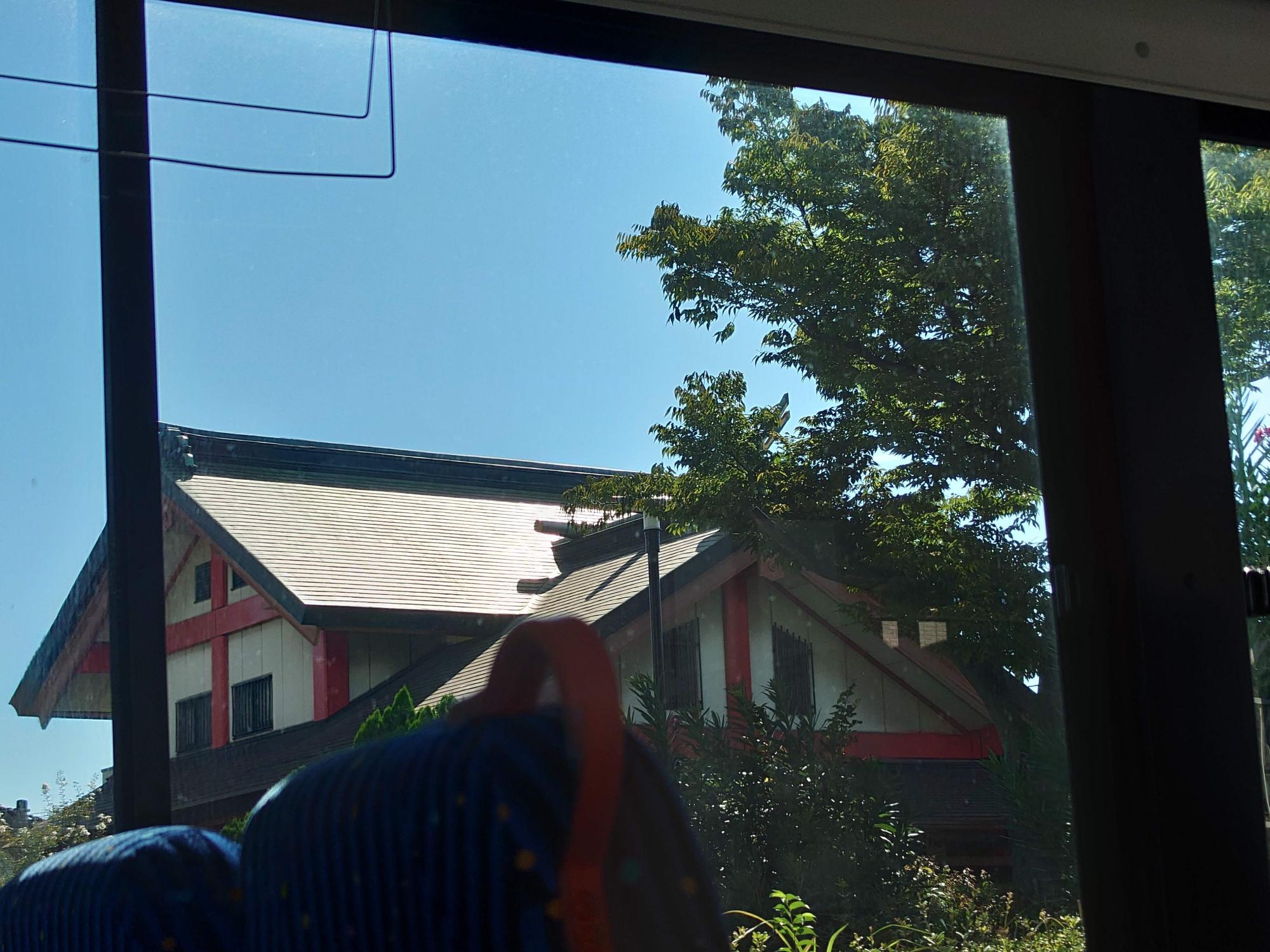 すると、左手に高須神社が見えてきます。ノンストップなので窓から眺めるだけになりますが、朱色の柱に白い壁が美しい神社です。