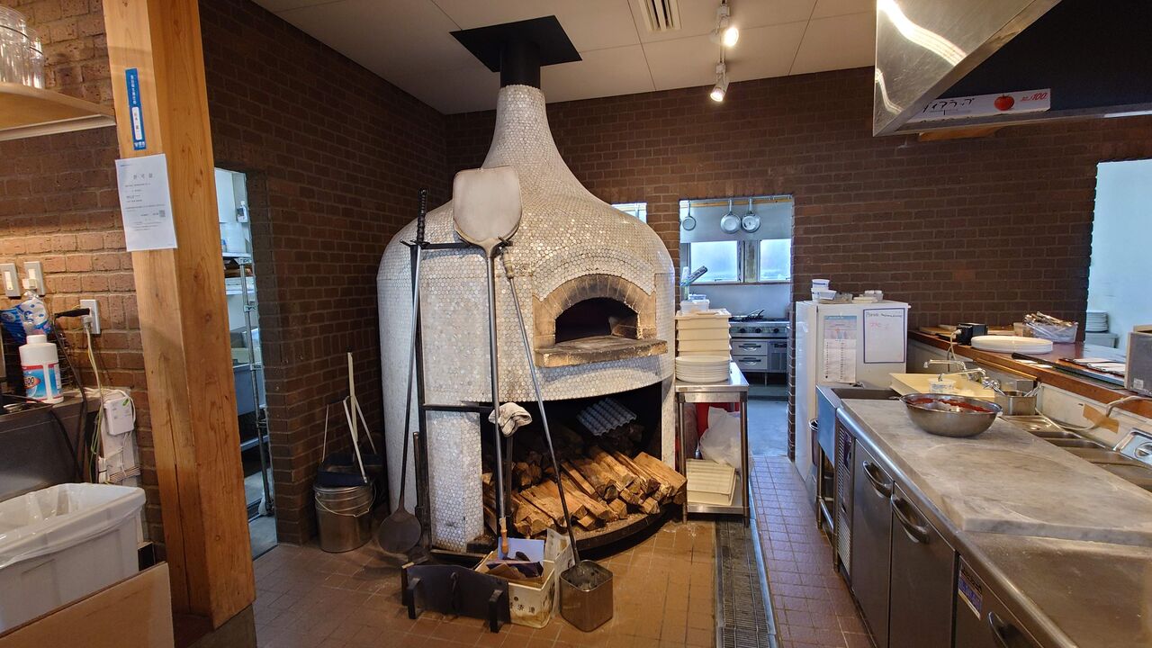 オーナーの肩書きもさることながら、お料理も美味しいです。店内もログハウス風でナチュラル素材で明るい雰囲気です。カウンター奥にはピザ焼き窯が見えます。