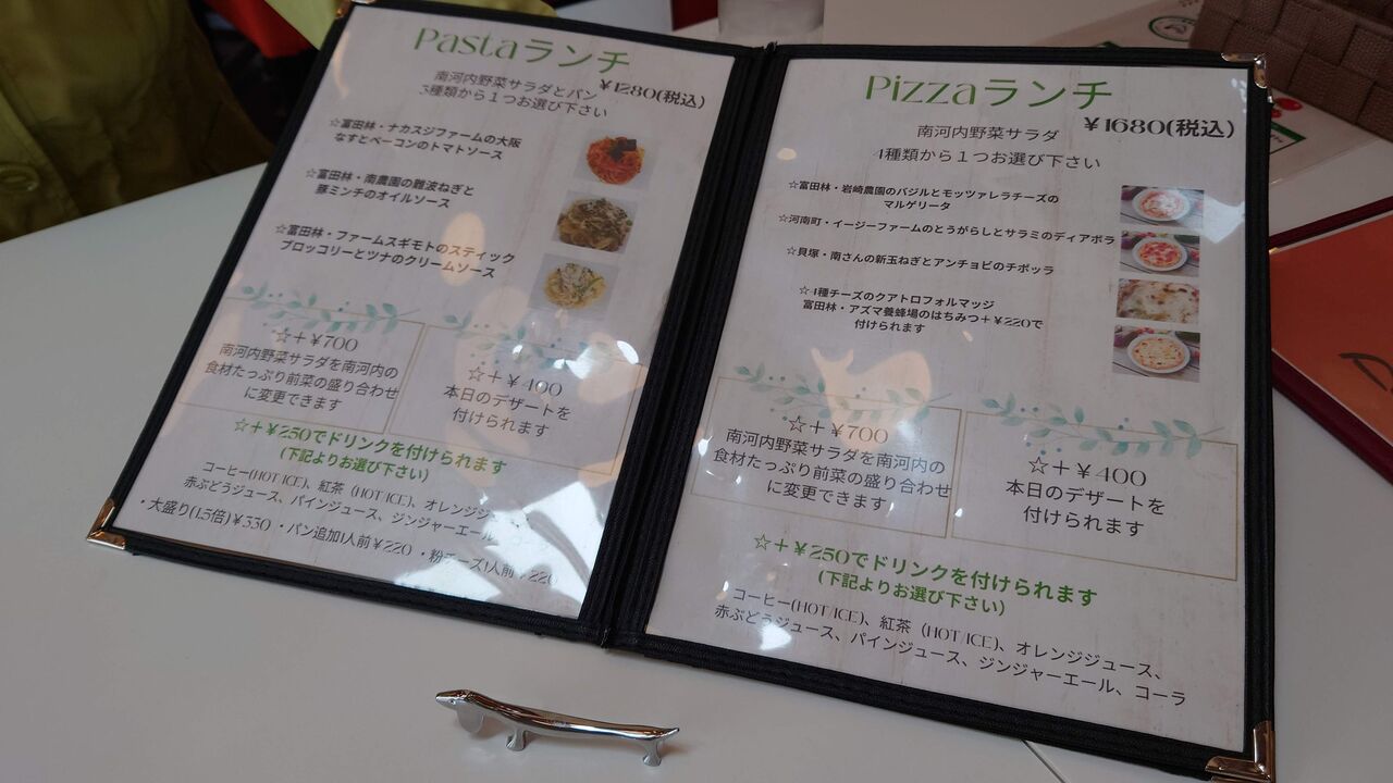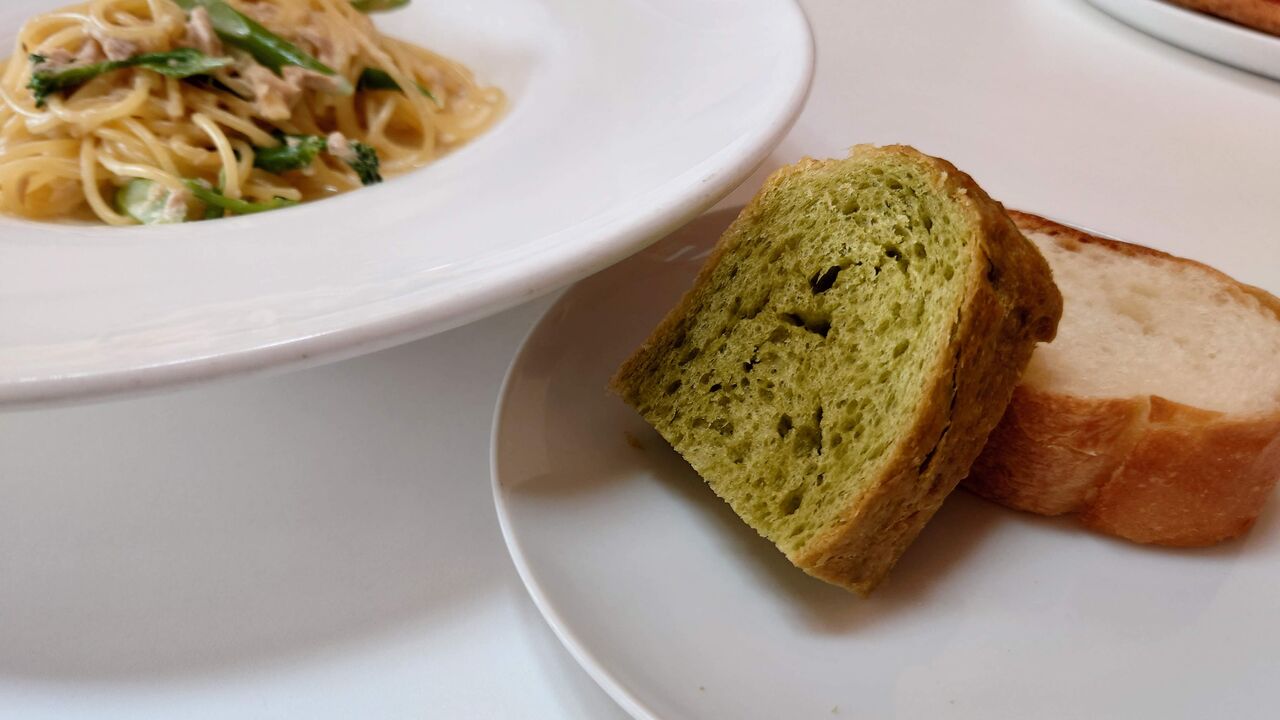 パンはバケットとほうれん草のパンでした。パスタは「富田林・ファームスギモトのスティックブロッコリーとツナのクリームソース」。ピザは「富田林・岩崎農園のバジルとモッツァレラチーズのマルゲリータ」をオーダーしました。