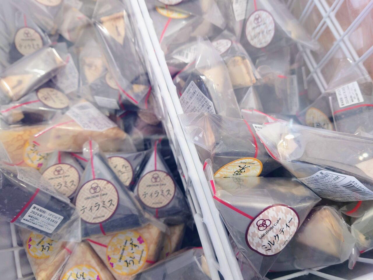 一見すると、コンビニのおむすびにしか見えない「おむすびケーキ」。"ティラミス" や"ミルクティー"、"ちぃず"などのフレーバーがあります。"ちぃず"だと、卵焼きでくるんだおむすびみたいになっているんですね。