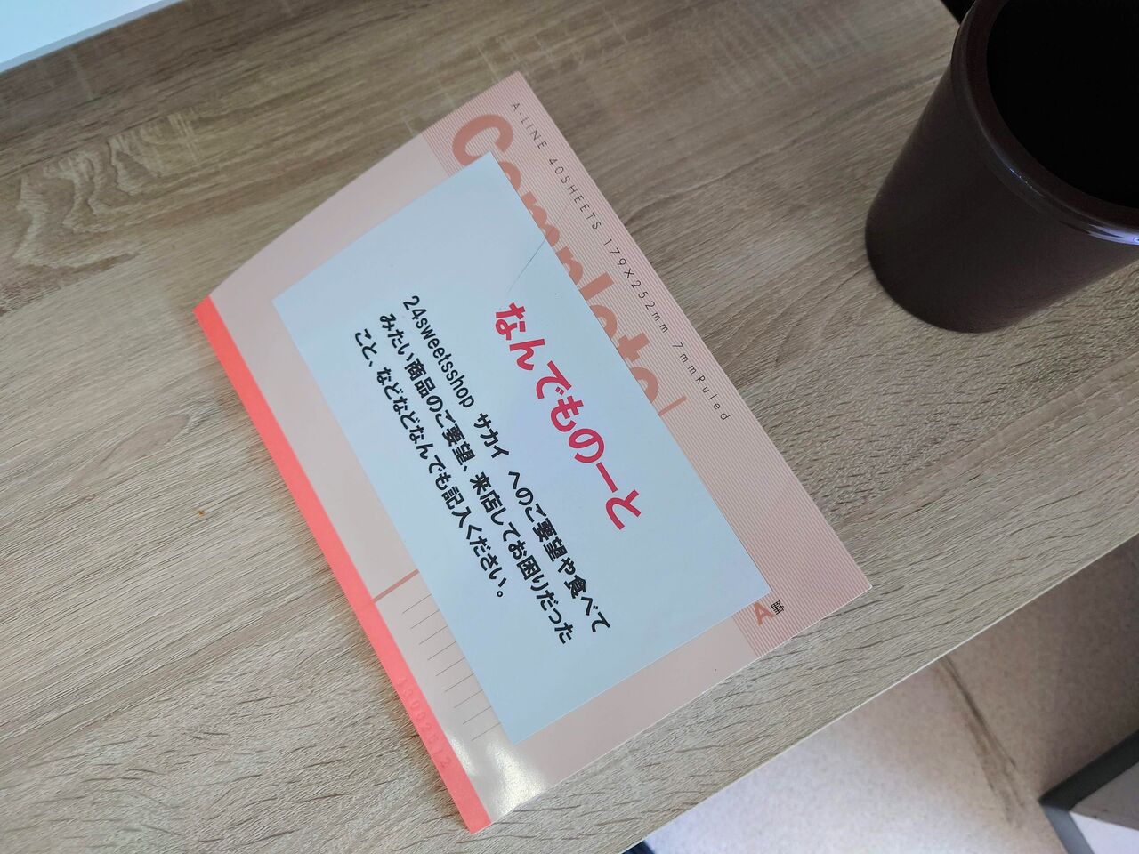 レジのところには「なんでものーと」が置いてあり、お客さんと店主さんの交換ノートみたいな感じです。気づいたことや要望を書けるようになっています。子供達が"美味しかった""ありがとう"など、かわいらしい字で書いてあるのがほほえましかったです。