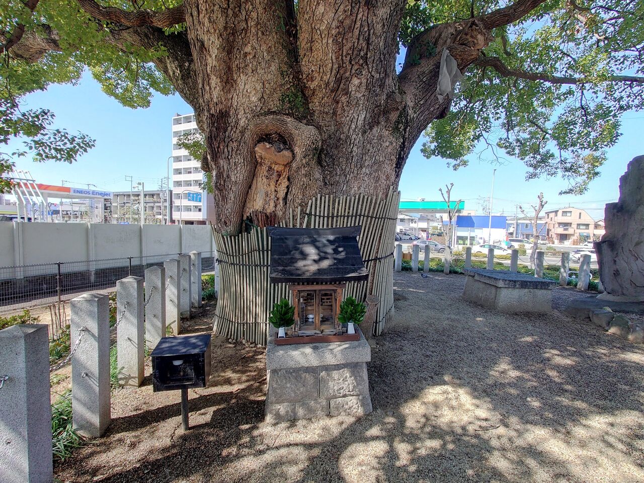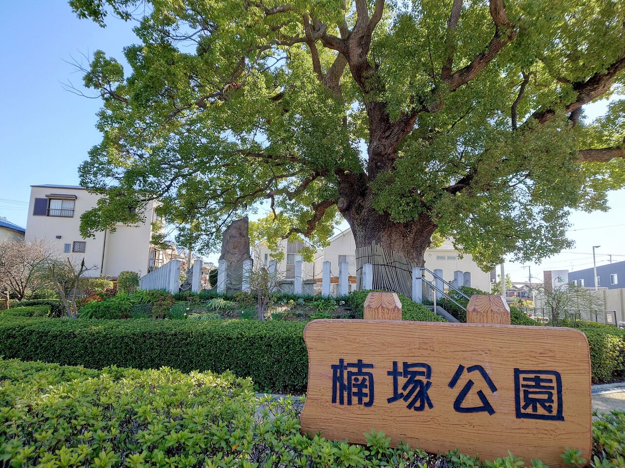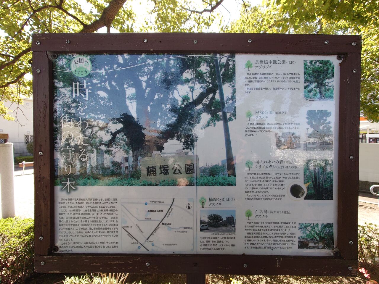 堺市に「ときはま線」と呼ばれる道路があります。正式名称は大阪府道28号大阪高石線と言います。おそらく、堺を通っているエリアだけ「ときはま線」と呼ばれています。その「ときはま線」を堺市北区中百舌鳥町の大阪メトロ御堂筋線なかもず駅から新金岡駅に向かって地上を歩いていくと、途中にそれは立派なクスノキがそびえ立つ公園があります。その名も楠塚公園です。