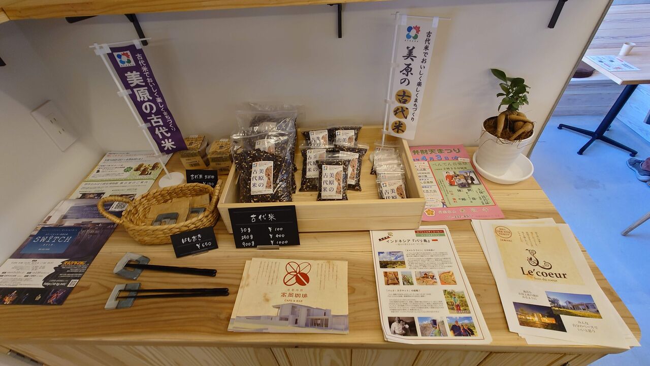 こちらの棚にはディフューザー用オイルが並んでいます。他には、コーヒー豆やカフェラテベースなどの棚もあります。美原の古代米も販売されています。
