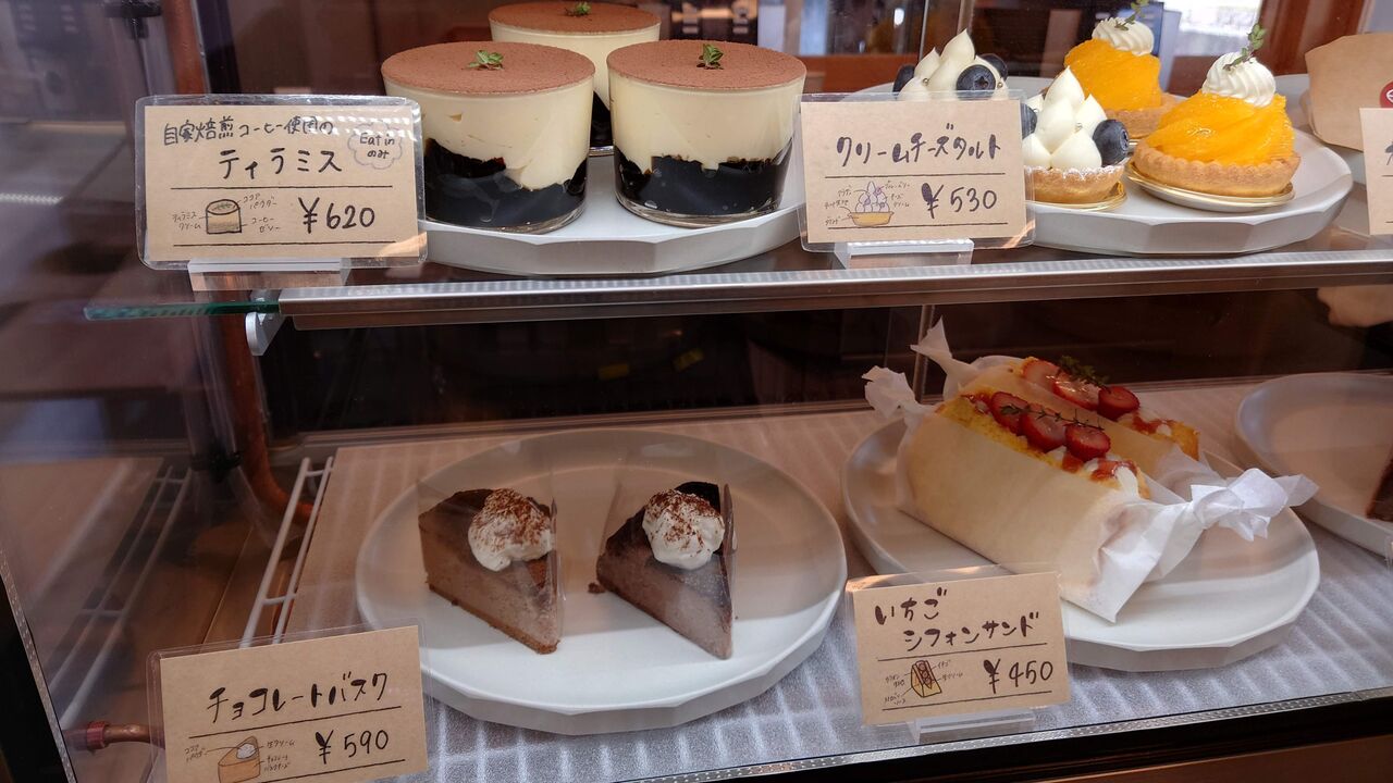 ケーキはガトーショコラやタルトやティラミスなどさまざまです。スペシャルティコーヒーの説明が店内に置いてありました。