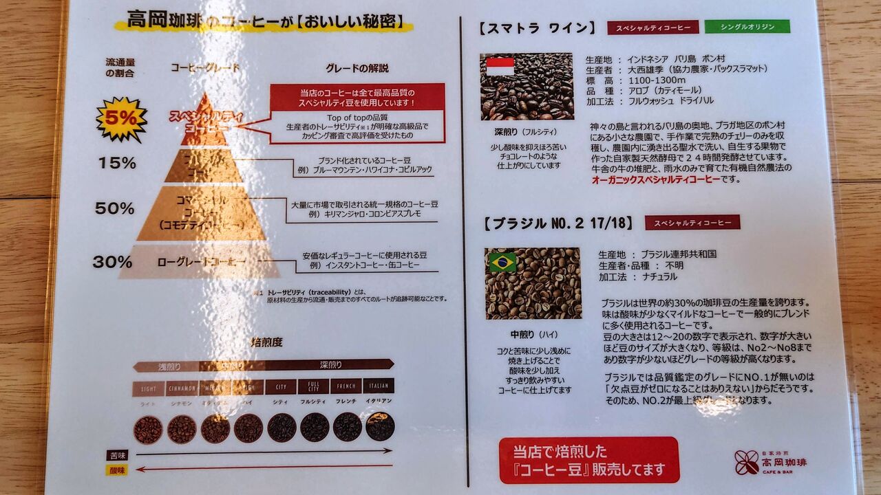 その、「高岡珈琲のコーヒーが【おいしい秘密】」によると、コーヒー豆の中でも5%しか流通していない貴重なものがスペシャルティコーヒーだそうです。