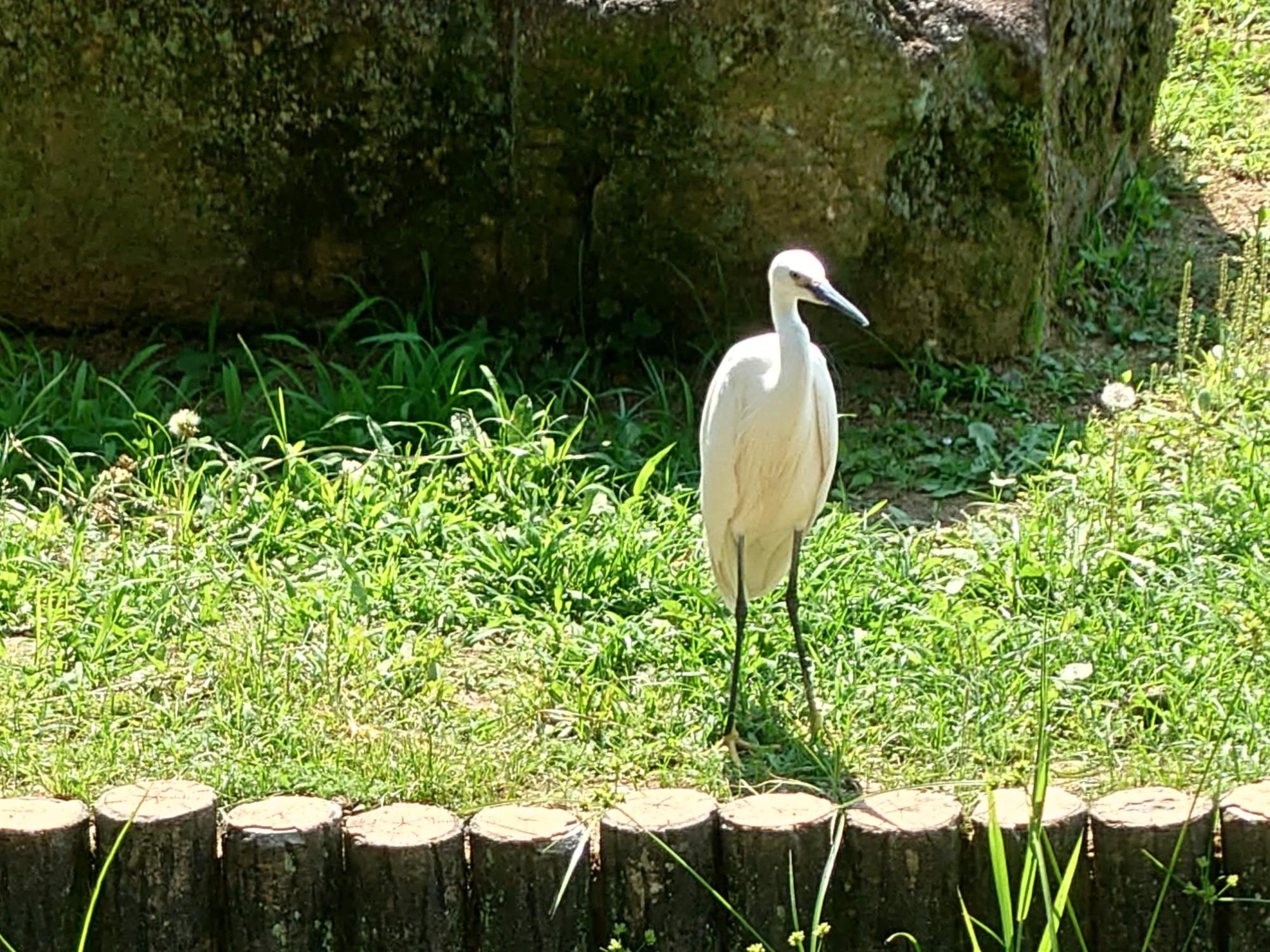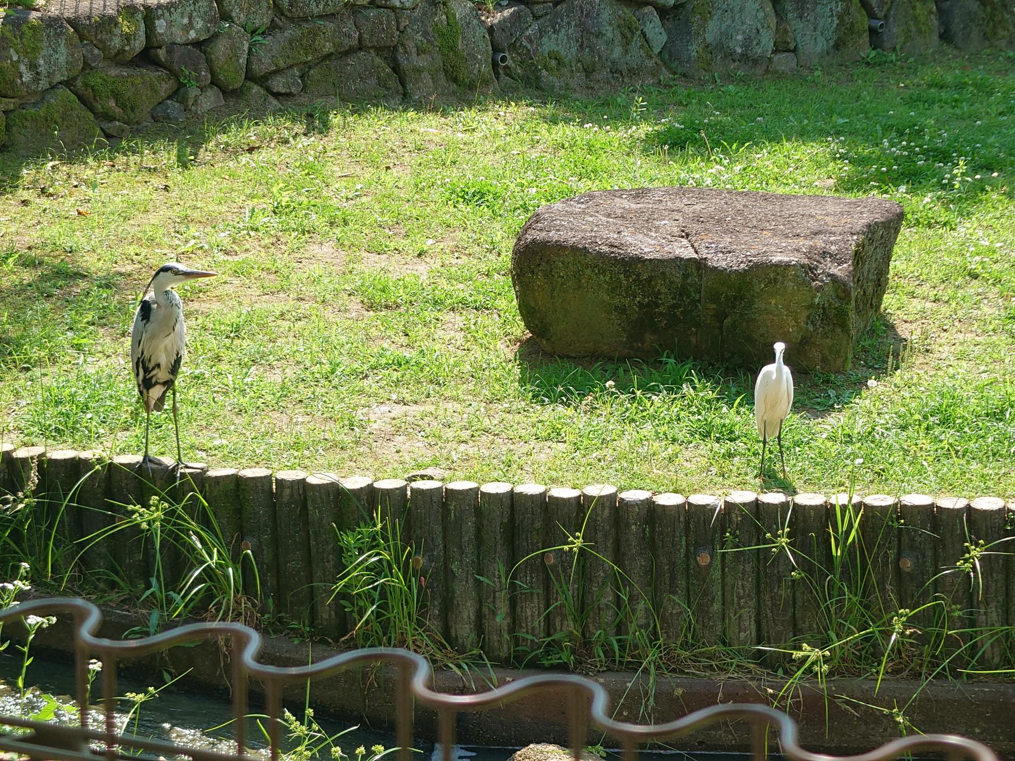 こちらはアオサギでしょうか。悠然とたたずんでいます。下の写真の 白くて少し小さめの方はコサギだと思われます。