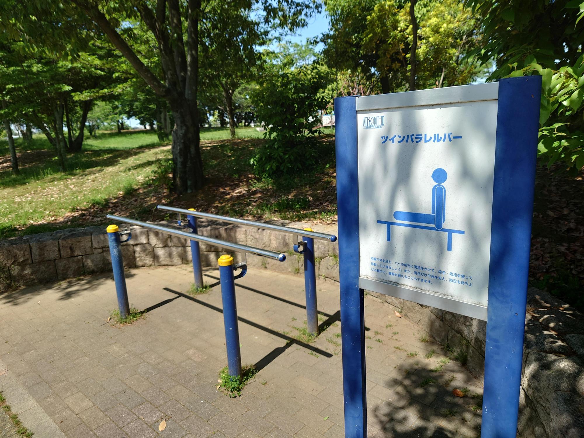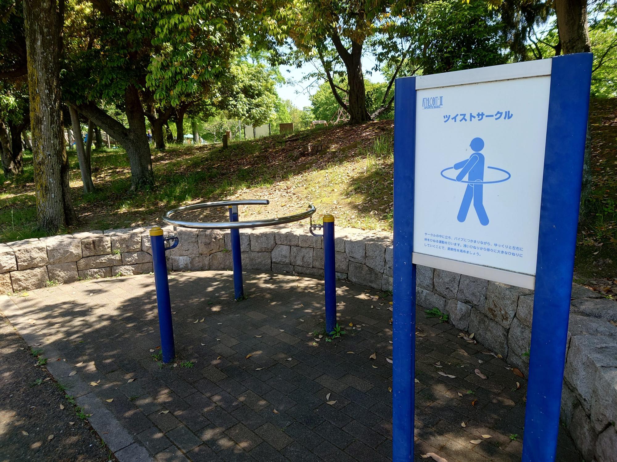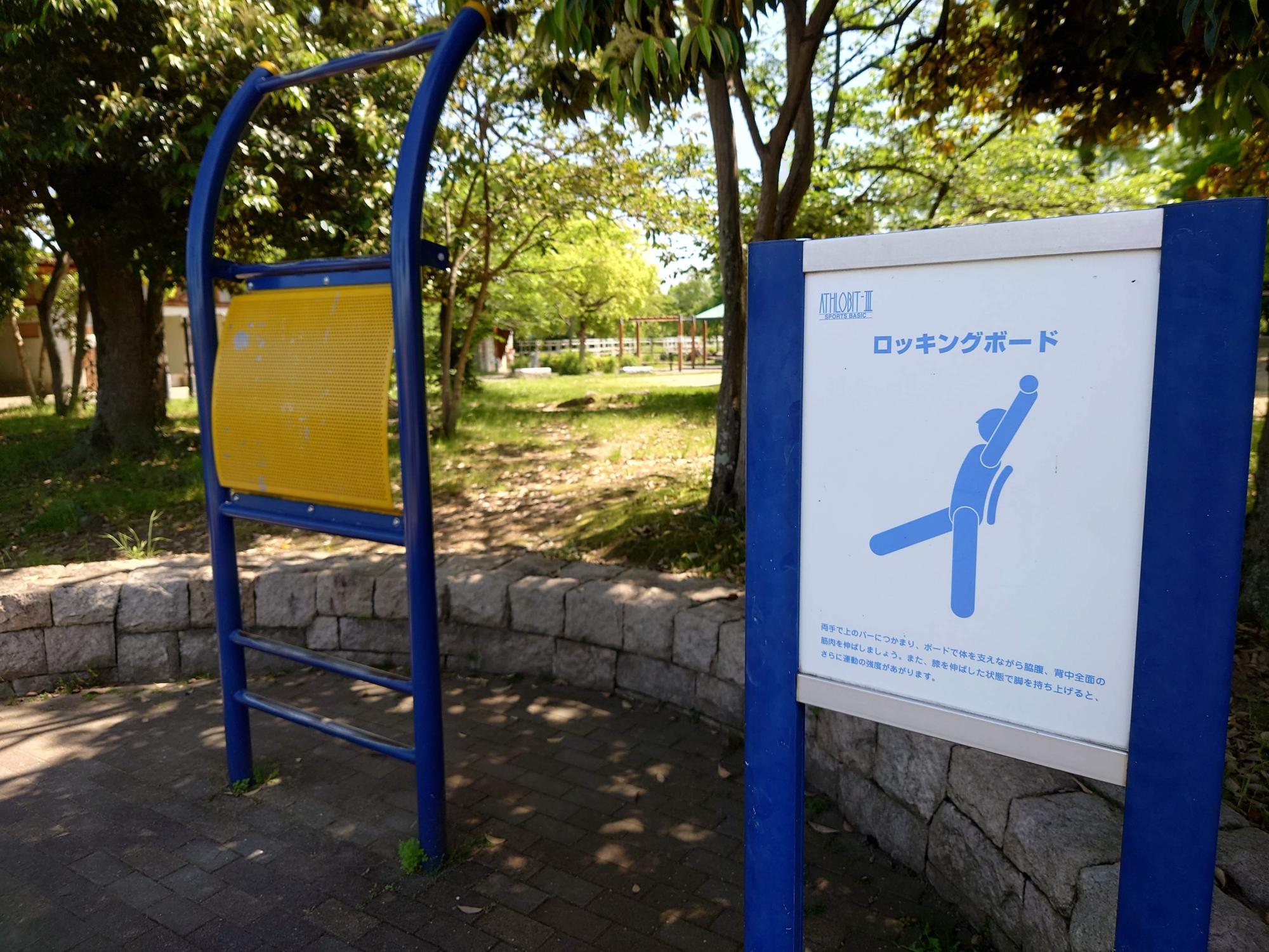 大きなエリア内に普通に滑り台など子供向けの遊具が設置されている「遊具広場」もありますが、公園を囲んでいる小道を歩いていくと、スポットスポットに点々と健康遊具が設置されています。なかなか筋力が必要そうな遊具もあります。