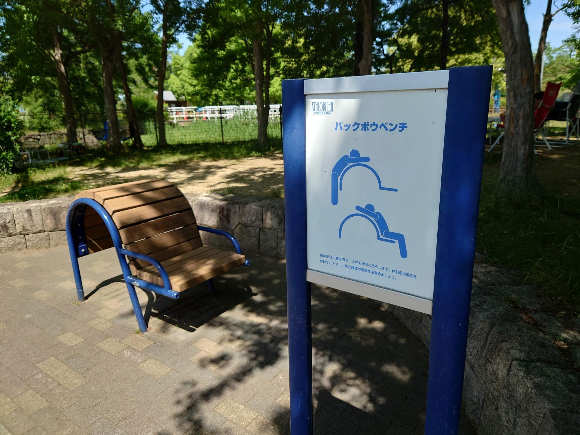 「バックボウベンチ」では、体をそらせて上体と腰部の柔軟性を高められます。これも結構、しんどそうに思えます。筋肉自慢の方じゃないと使いこなせないような気がします。いかがでしょう。遊具とはいえ、なかなか本格的な筋トレができる設備になっていると思われませんか? お花や野鳥を見たり、バーベキューもできる公園ですが、健康遊具でさらなる健康を目指してみてはいかがでしょう。