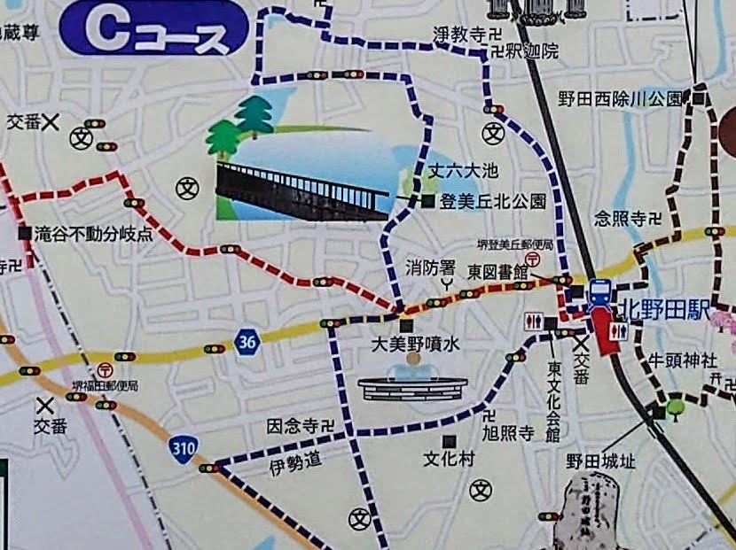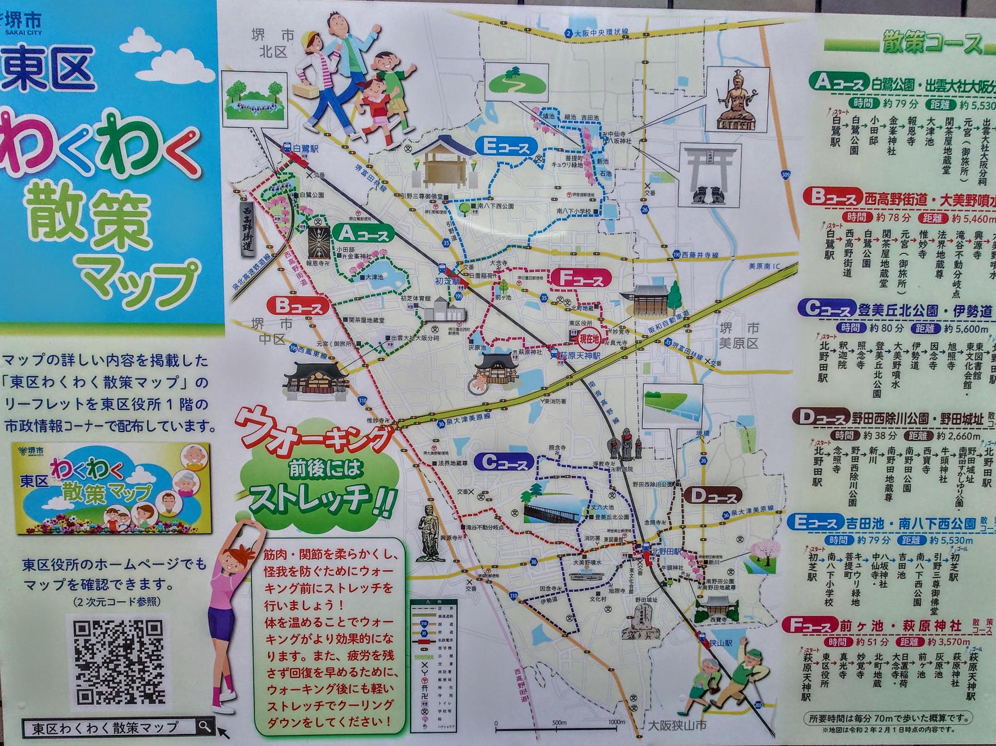 そしてその中央にある大美野噴水は、堺市東区の「わくわく散策マップ」のルートにも組み込まれているほどの存在感を誇ります(上のマップのCコースです)。