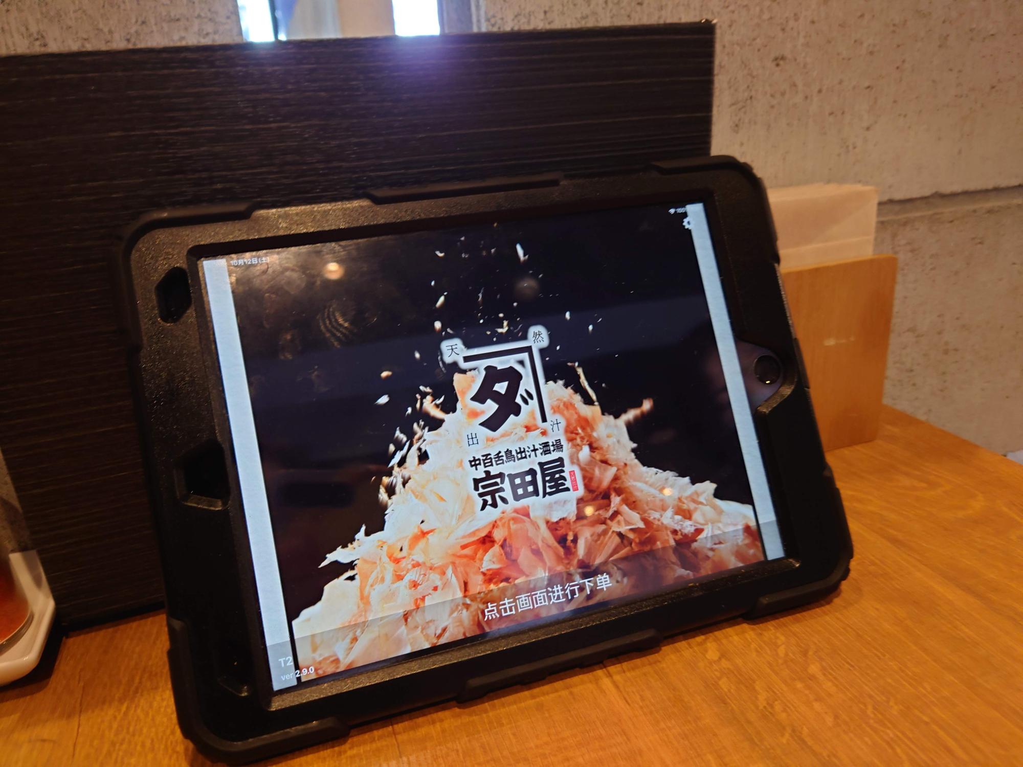 各席にタッチパネルが置いてあり、こちらを使って自分で注文します。出汁酒場だけあって、トップページはてんこ盛りのかつお節です。