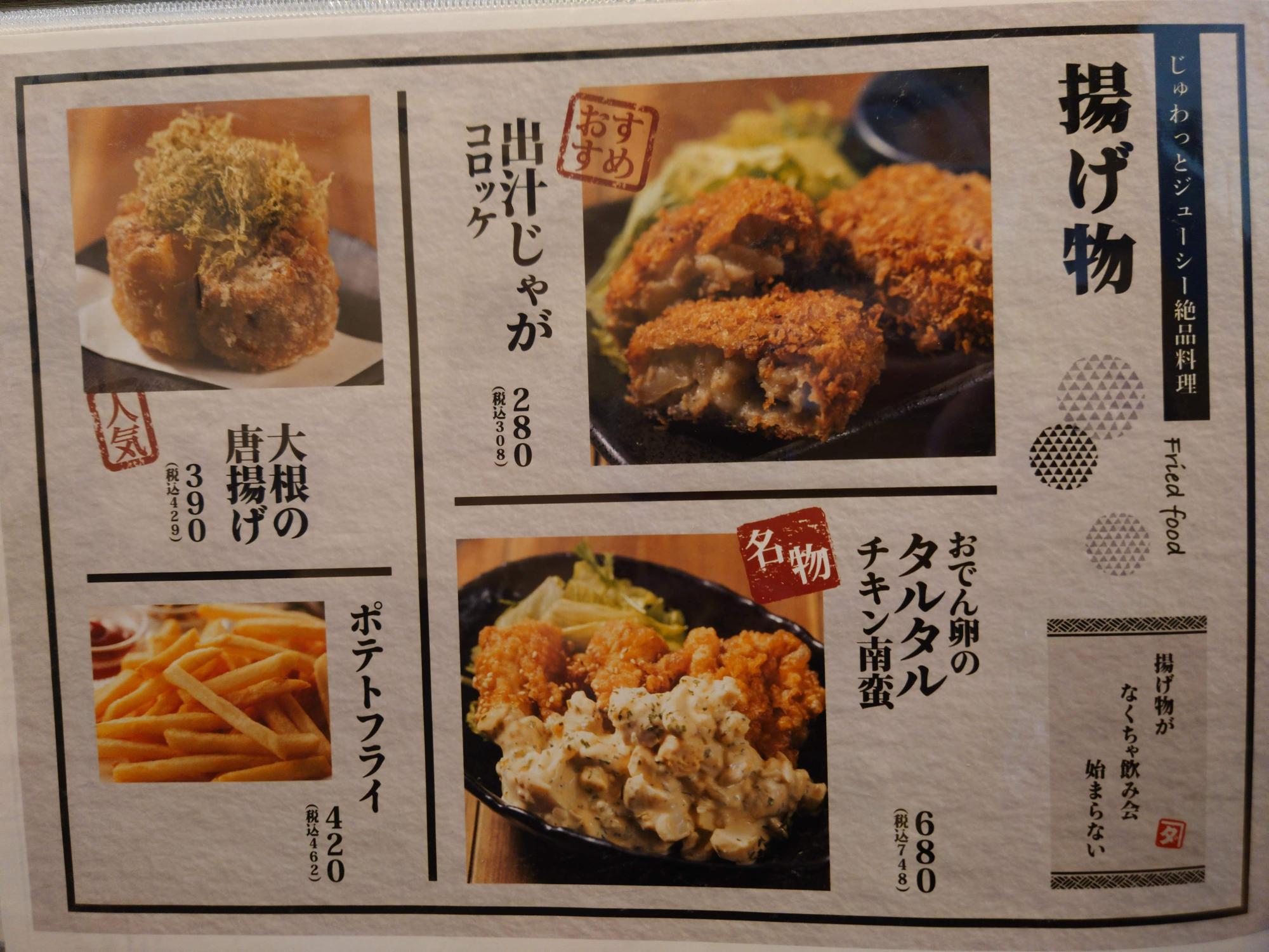 出汁酒場だけあって、出汁料理、おでんもあり、おでん大根の唐揚げ、おでん卵のタルタルチキン南蛮などもかなり美味しそうです。
