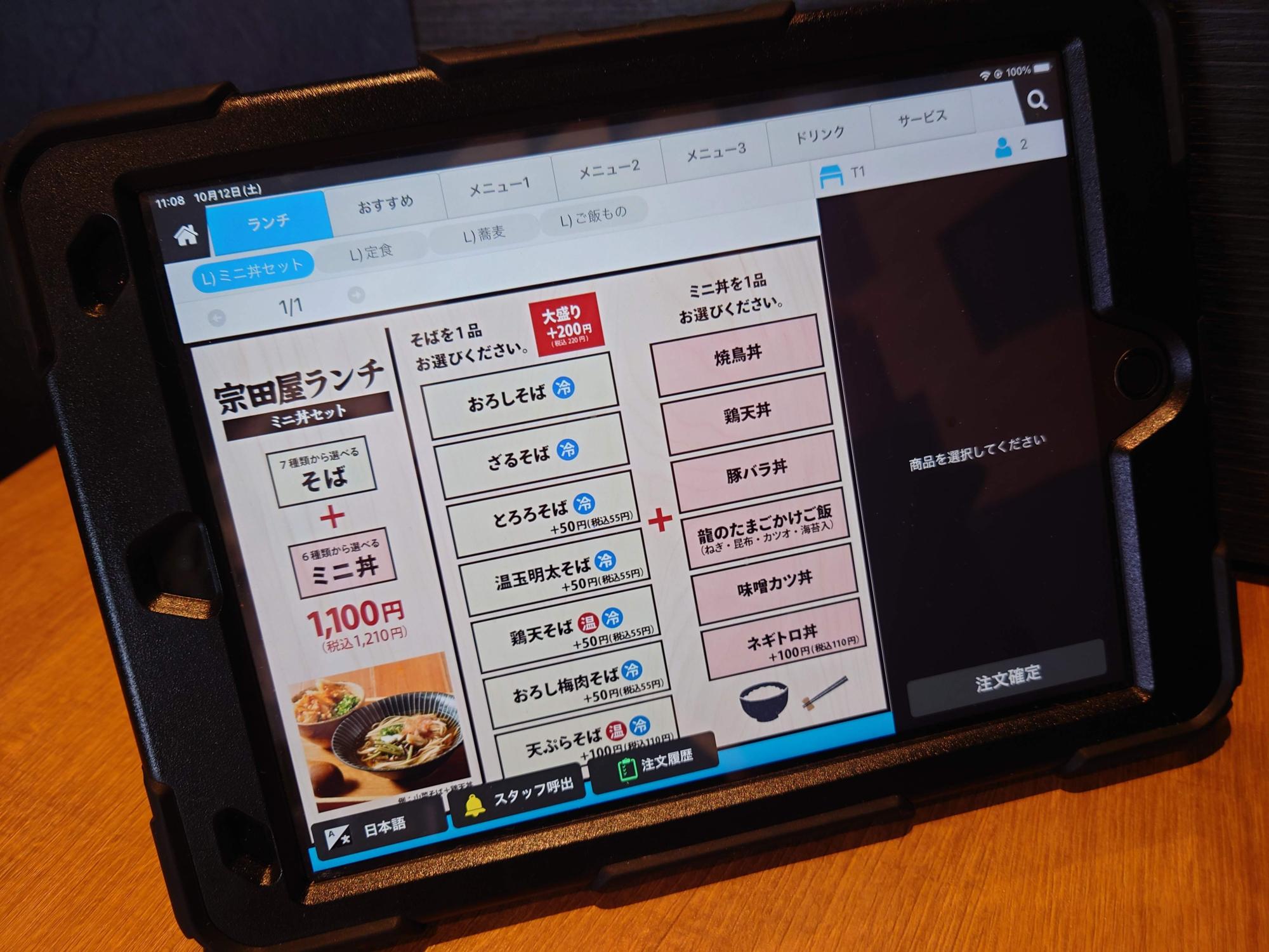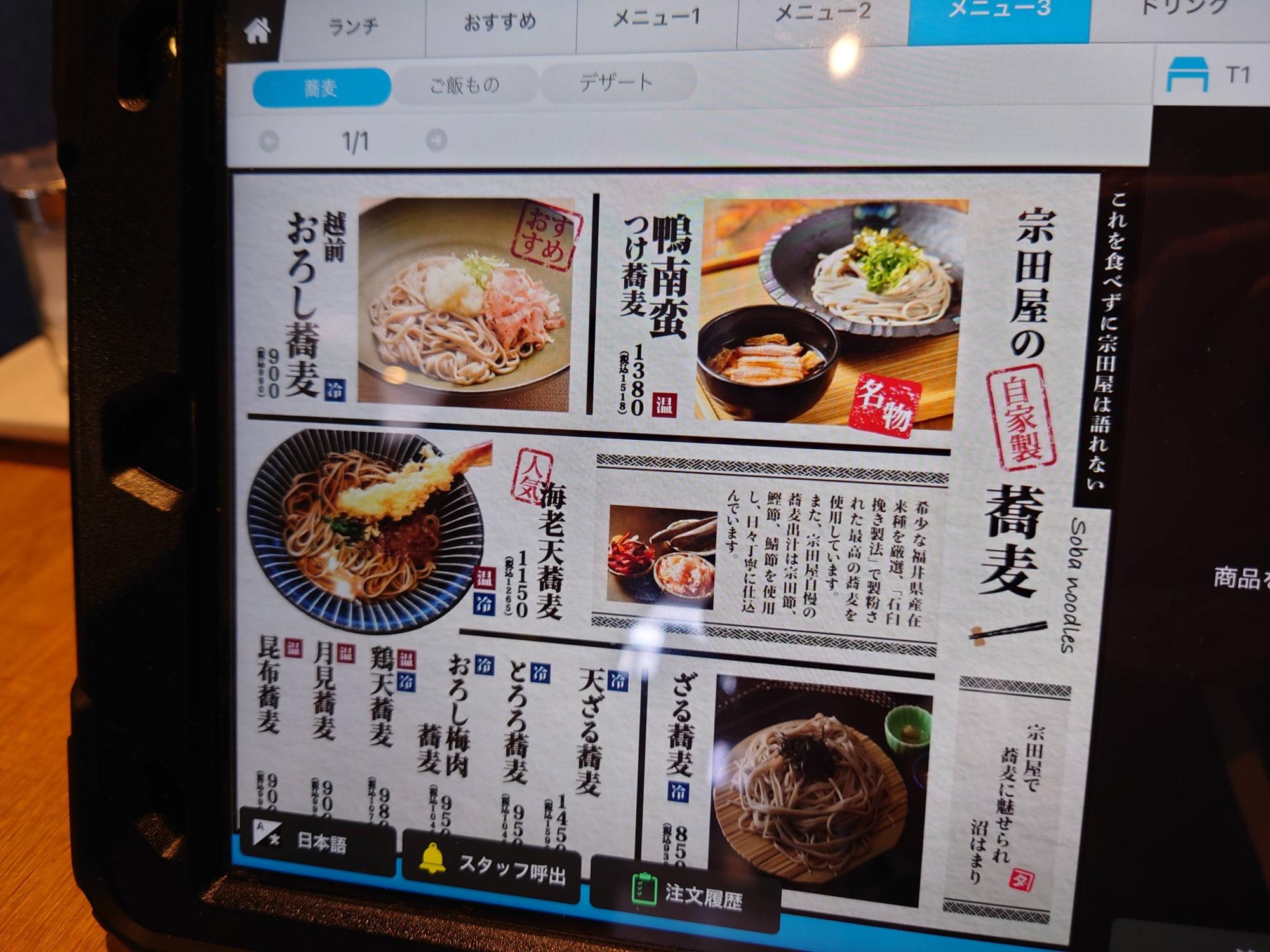 今回は、店頭看板にあったお蕎麦ランチにしたくて入店したので、そちらから選ぶことにしました。そういえば店頭看板にあった「炊き餃子」も美味しそうだったなぁ、と迷いつつタッチパネルの「宗田屋の自家製蕎麦」のページから選びました。