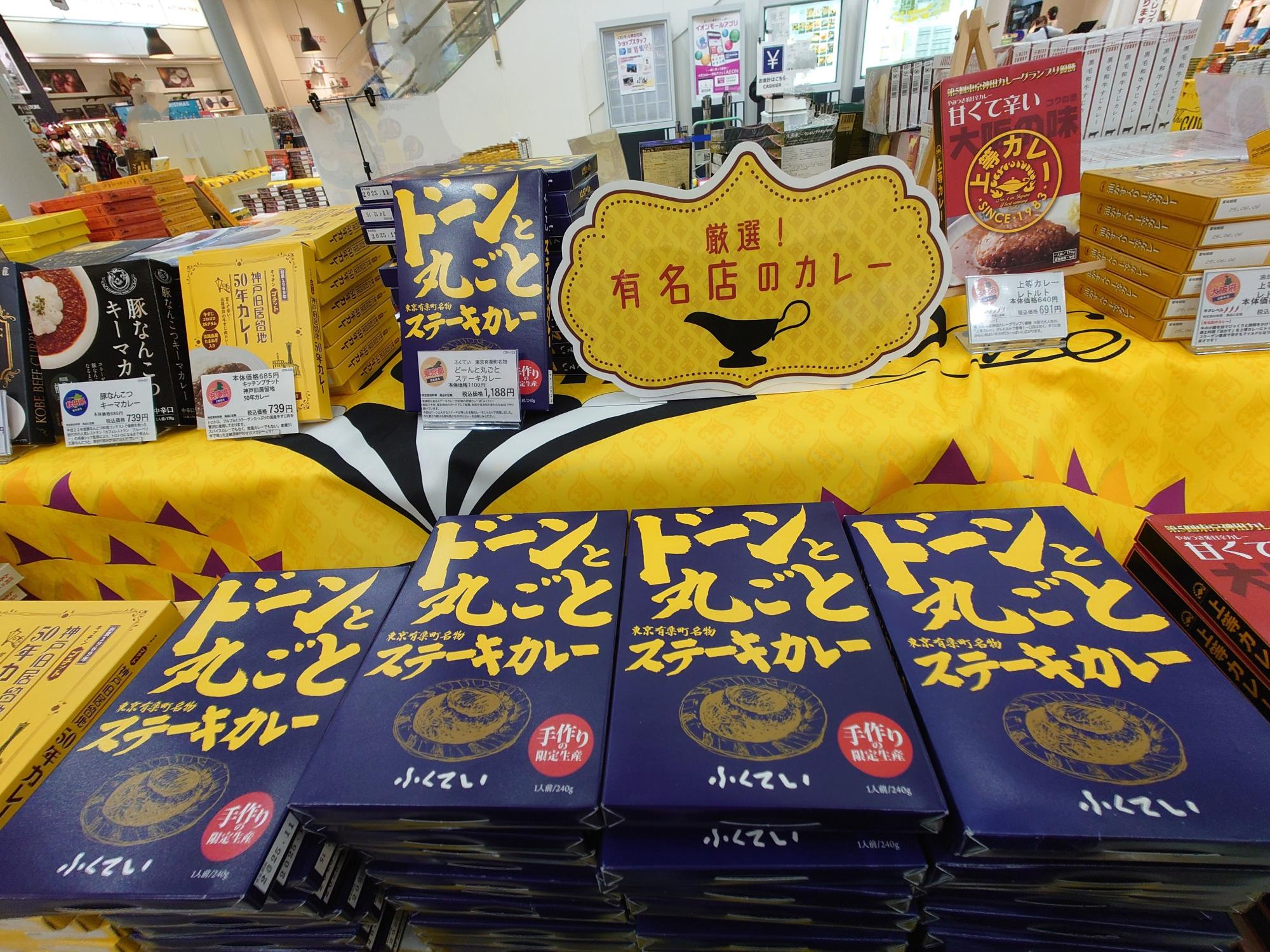 カレー有名店のカレーコーナーの「ドーンと丸ごとステーキカレー」。パッと見ただけでも、全体的にケースのデザインも魅力的ですよね。