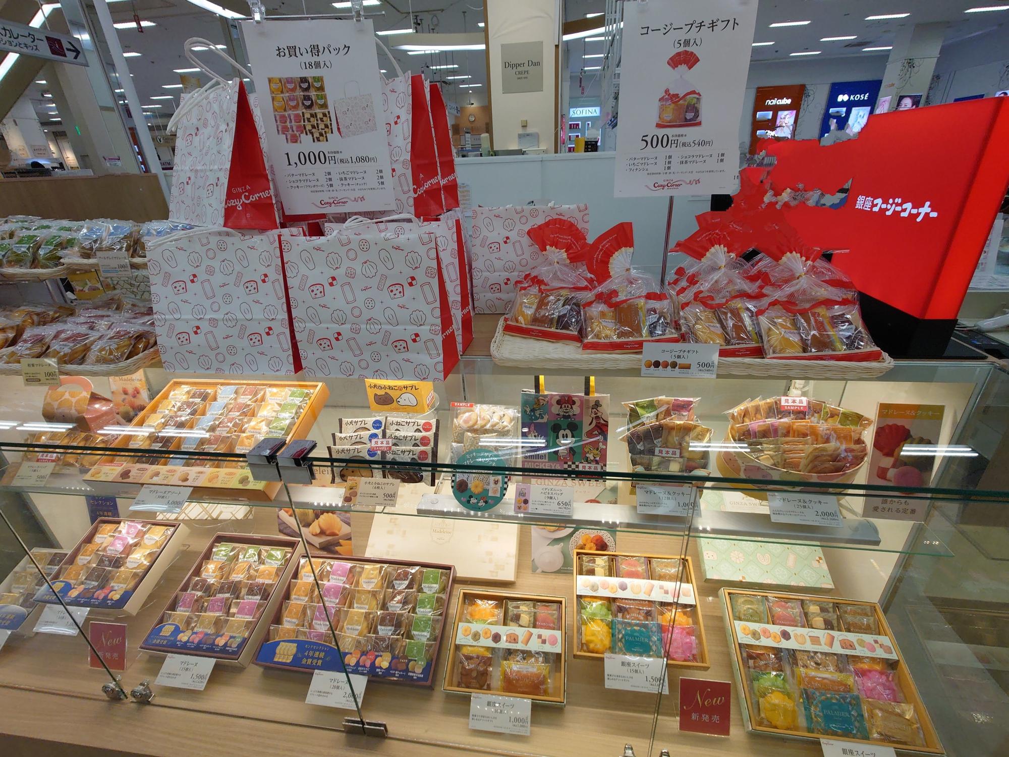 ショーケースはカラフル! マドレーヌやサブレ、クッキーなどの贈答用によさそうな焼き菓子が並んでいます。かわいらしいキャラクターがプリントされていたり、ラッピングが可愛かったり、手土産にもいいですが、自分用にも欲しくなります。あれ? でも、「銀座コージーコーナー」といえば、ケーキは? 焼き菓子や贈答品だけのコーナーなの? と、一瞬、誤解してしまいましたが、実は調剤薬局側に回ると、ケーキももちろん販売されていました。