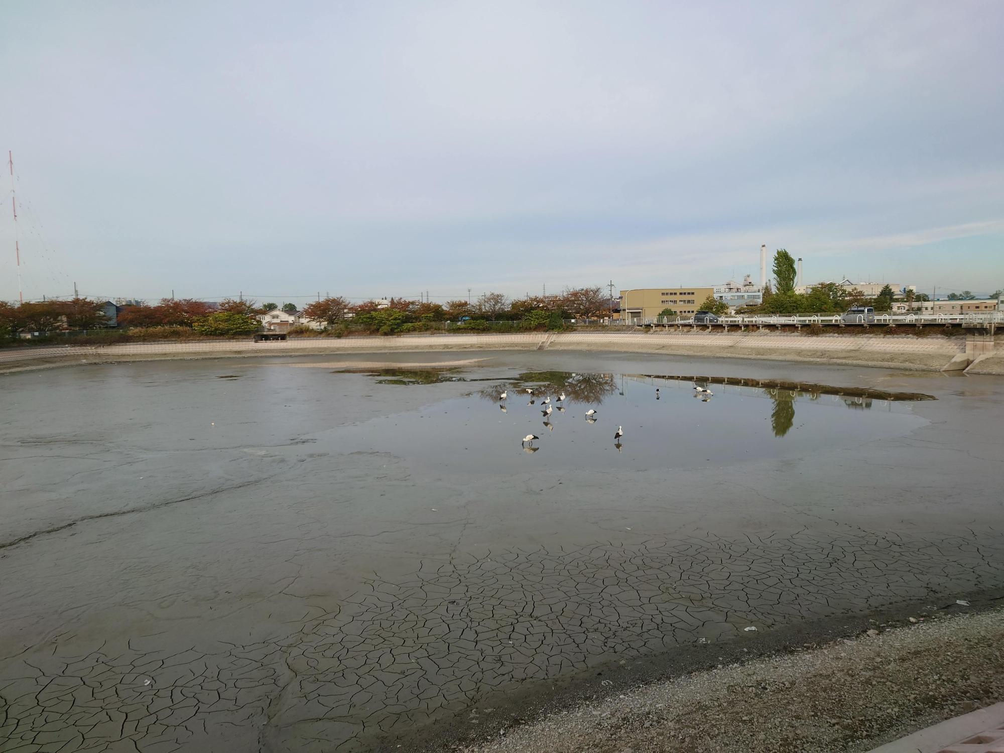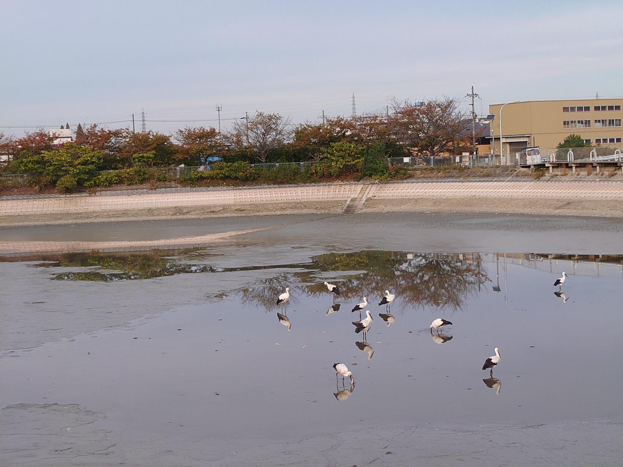 2024年11月初旬のある朝、池の周りにたくさんの人々が集まっていて、その視線の先を辿ると、そこには足が長く、大きな体をした鳥の群れがいました(2024年11月8日撮影)。今回、鳥が集まっていたのは「埴池(←PDFが開きます)」という池なのですが、池の水位がいつもより下がっており、たくさんの鳥が池底に降りて餌をついばむ様子が見られました。