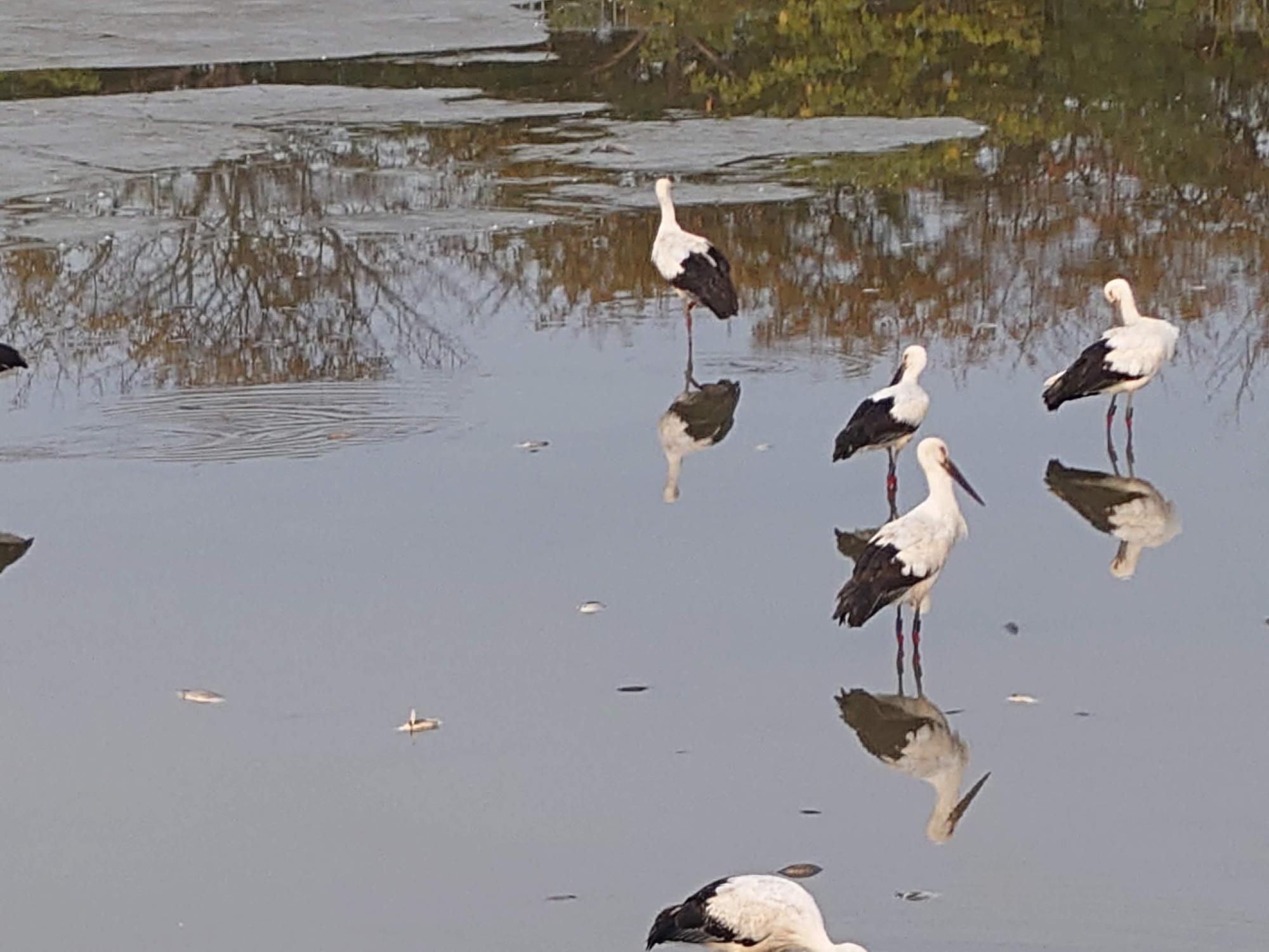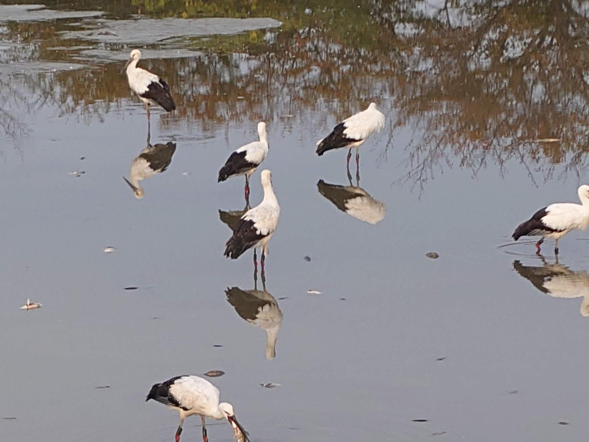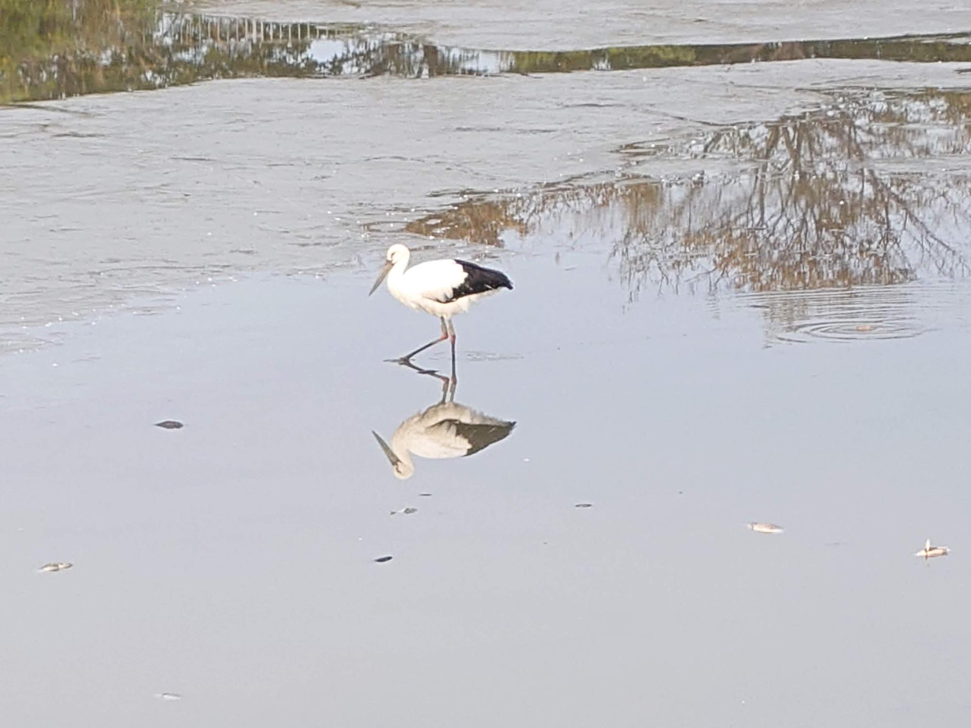 それでも、優雅に歩く野鳥の姿が撮れました。水面が凪いでいるので、姿がそのまま映っています。 そして正直、鳥の種類が何か分からなかったので、近くにいた人に聞いてみたら、なんと! この鳥は国の特別天然記念物、「コウノトリ」との事!