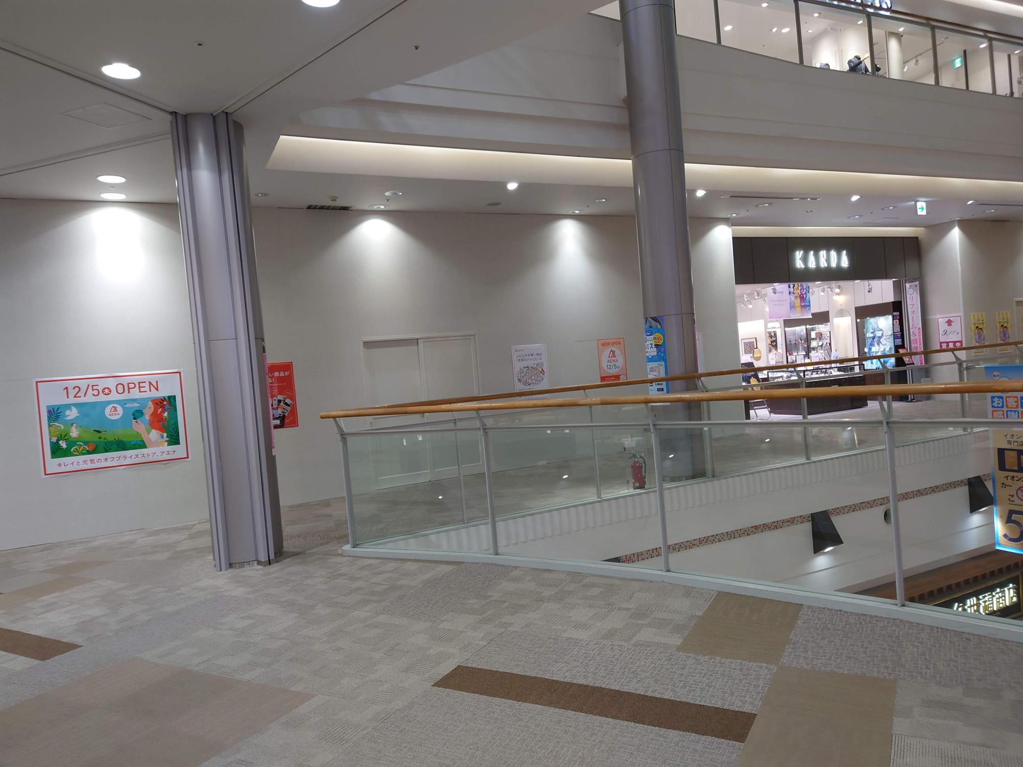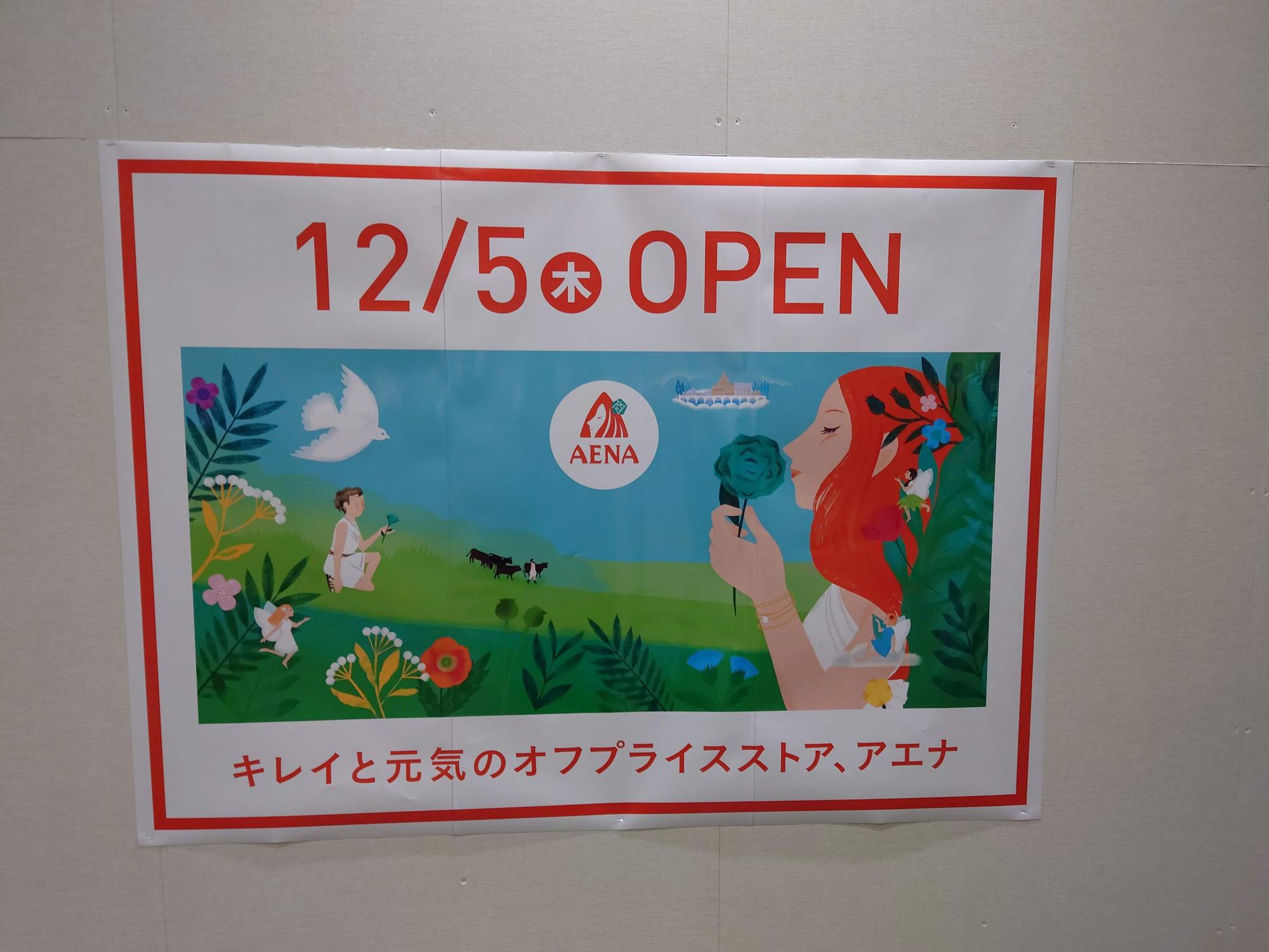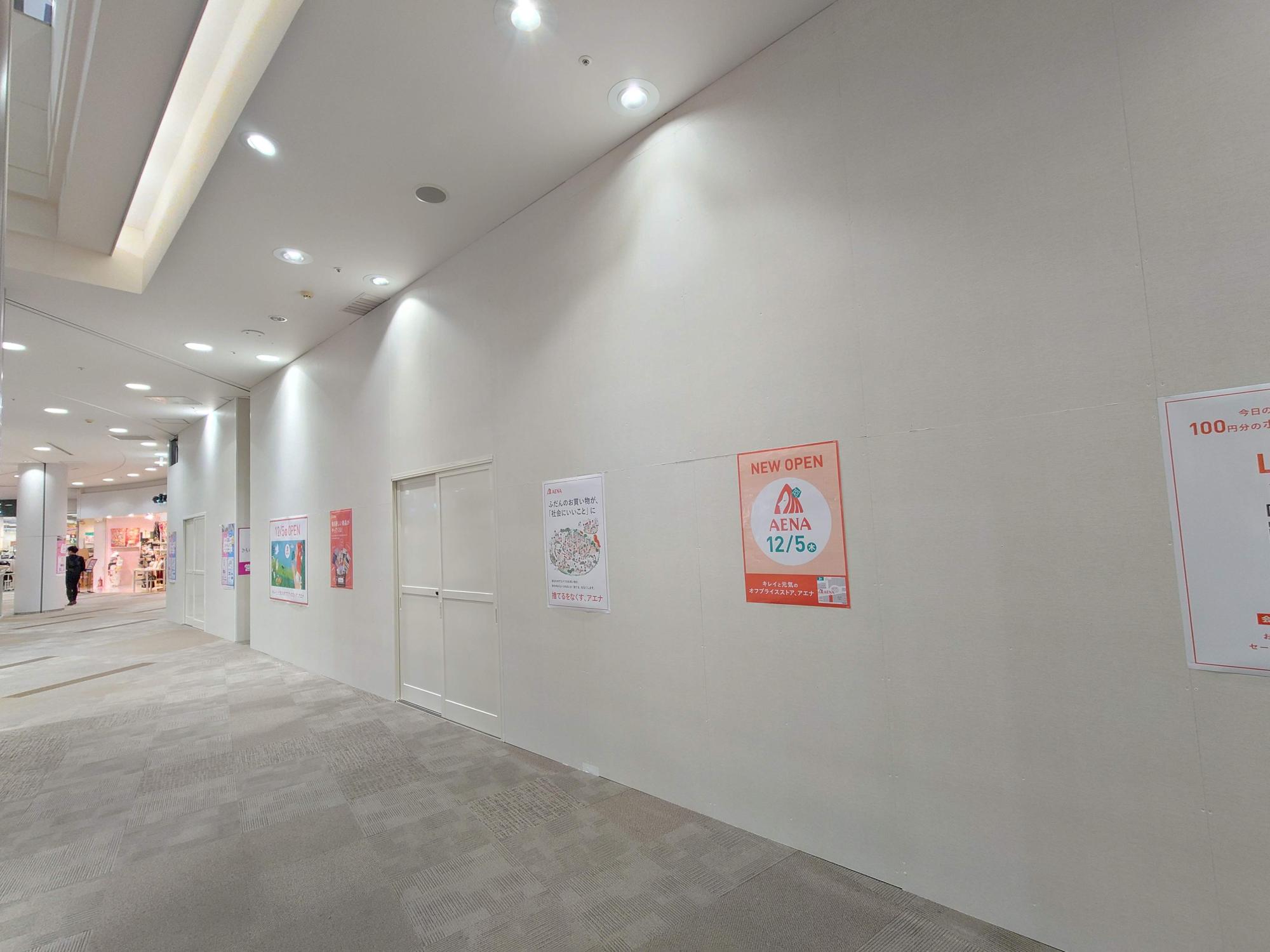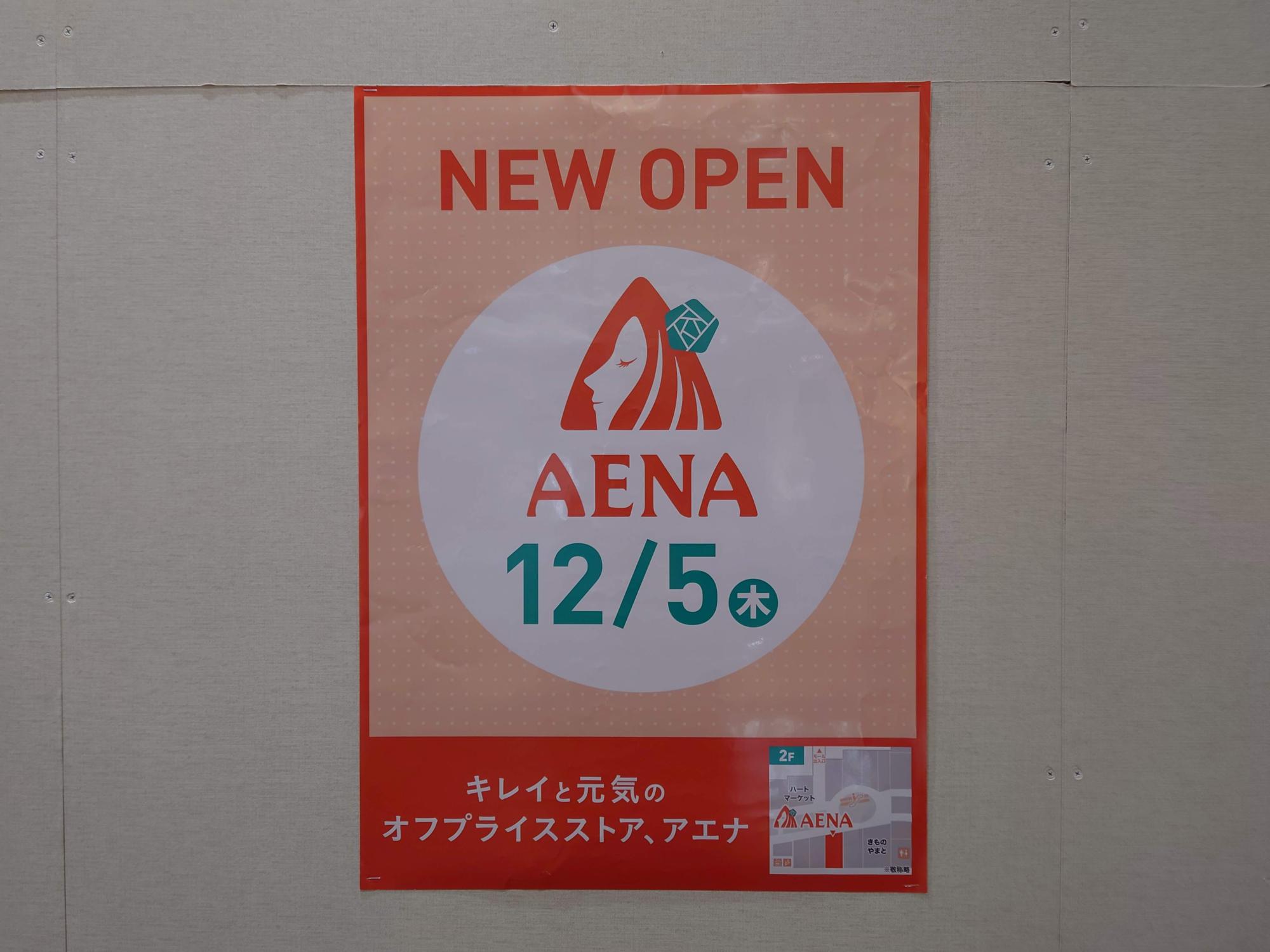 イオンモール堺北花田の2Fの、よくポップアップショップが出店していたエリアが現在(2024年11月初旬)、白い壁に覆われていますが、そこに”NEW OPEN AENA 12/5(木)”の文字がプリントされたポスター貼り出されていました。