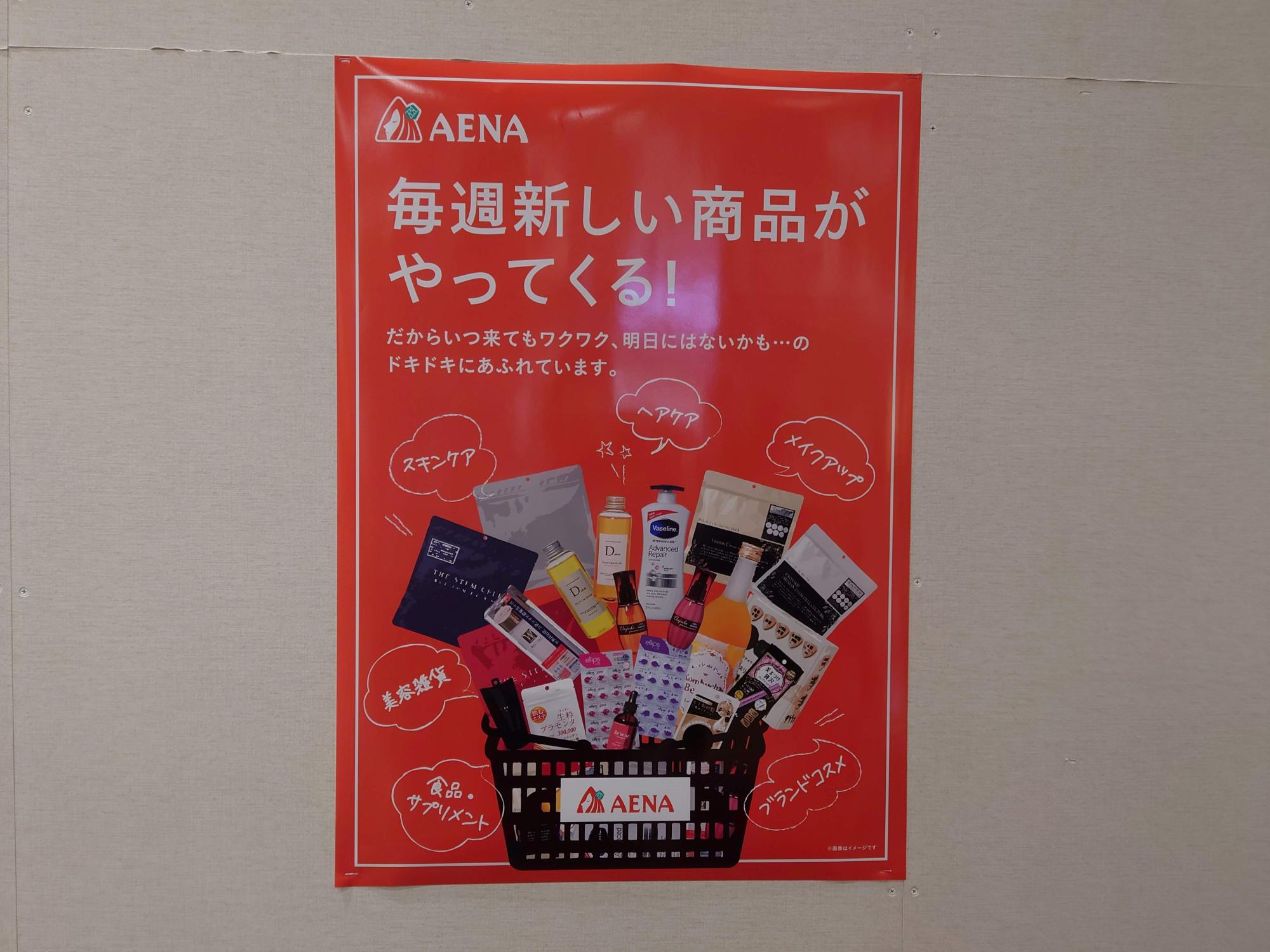 ポスターに掲載されている商品だけでも見覚えのある方も多いのではないでしょうか。スキンケア・ヘアケアなどの美容雑貨や食品やサプリ、ブランドコスメなどの新しい商品が毎週やってくるストアだそうです。いつ訪ねても新しい商品に出会えそうで楽しみですね。