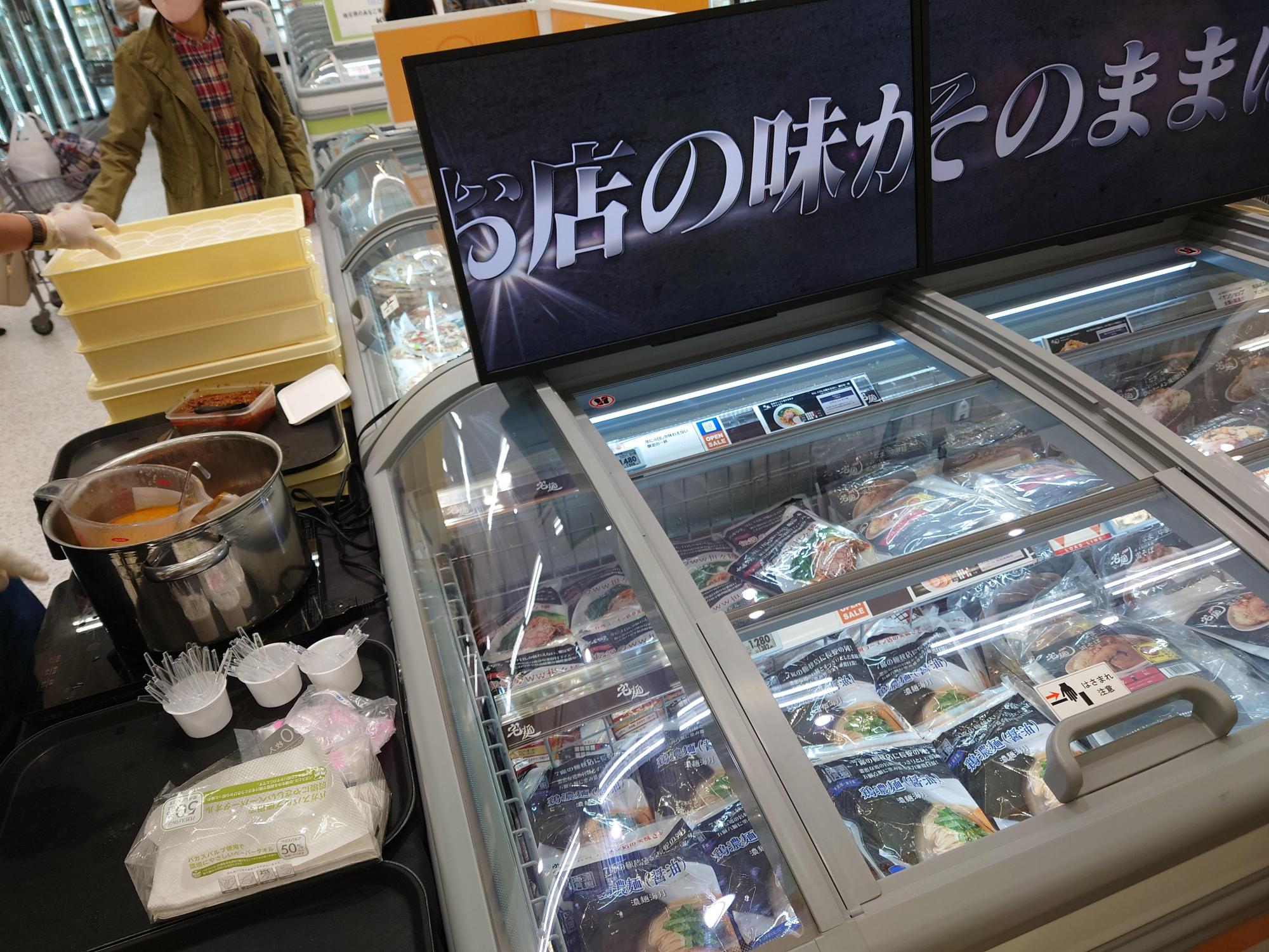 総合スーパー・イオン堺北花田店の1F、食品・日用品のレジを出たところのかなり広いエリアに展開されています。白&オレンジ&ブルー基調の明るい雰囲気です。冷凍食品だと、手間ひまかかる料理や、名店の味などが手軽に味わえていいですよね。