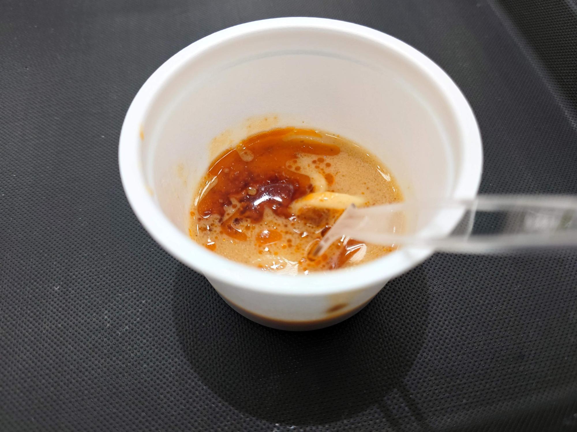 小さなカップに入れてくれましたが、こんなに小さくても香りが凄くて、お味も濃厚で美味しいスープと麺でした。担当の方が、冷凍ケースの傍らでお湯が入ったお鍋でグツグツ温めておられました。行列店のものが自宅でいただけるって素晴らしいですね。