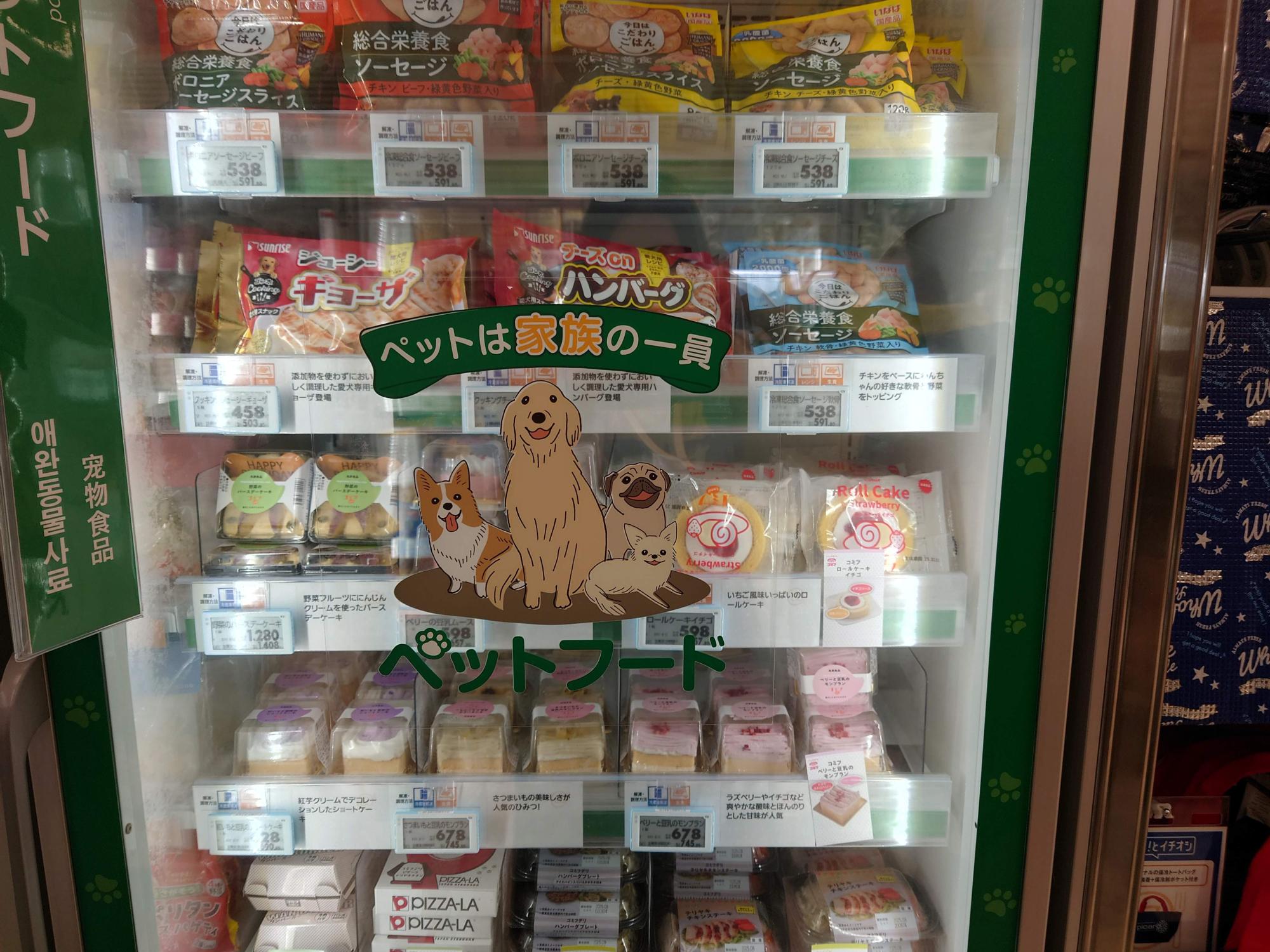そしてなんと! ペットちゃんのお食事のコーナーもありますよ。ソーセージやハンバーグ、餃子まで! 人が見ても美味しそうなケーキやピザも。まさに家族の一員の食事です。人とペットちゃんの分も一度に購入できますね。