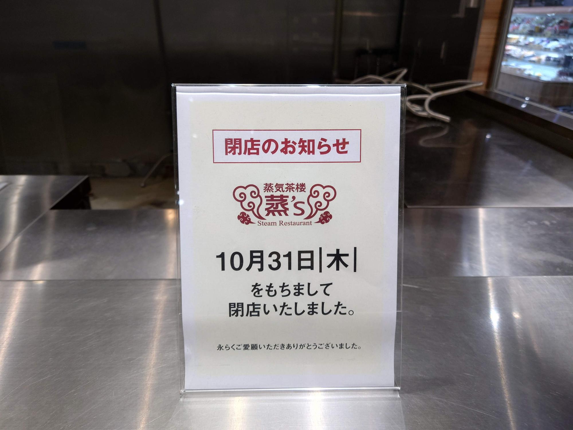 そして、2024年10月31日(木)、残念なことにその、フードコートの「蒸」ブースを担う「蒸気茶楼 蒸’s(ジョーズ)」さんが閉店されていました。ブースの中が片付けられており、窓口に閉店のお知らせが置いてありました。