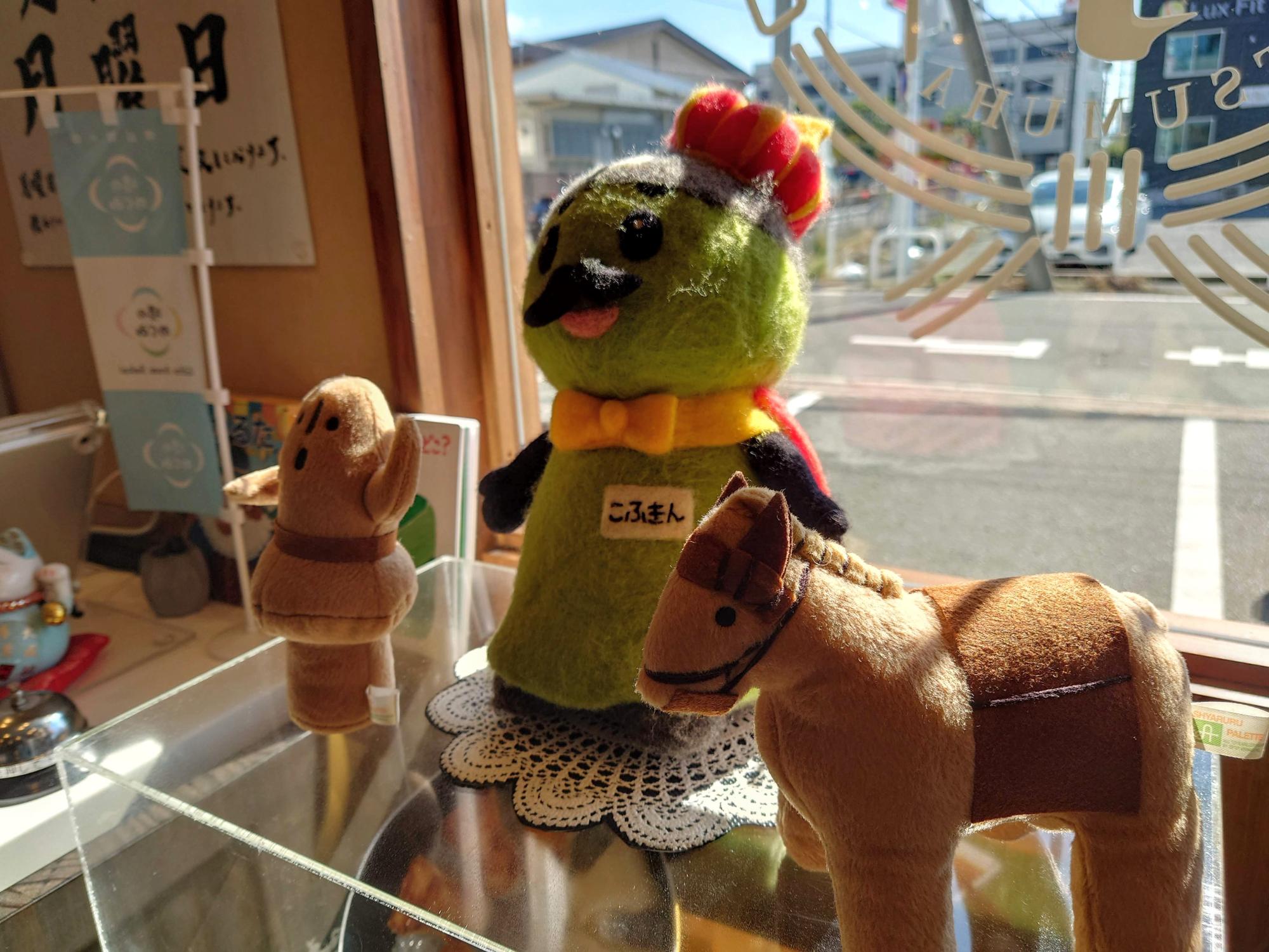 窓辺にもかわいらしいぬいぐるみが置いてあります。埴輪と、お店のオリジナルキャラクターの「こふきん」くんです。「こふきん」くんはメニューにも登場して、大活躍しています。メニューが見ているだけで楽しくなるものなので、少しご紹介。