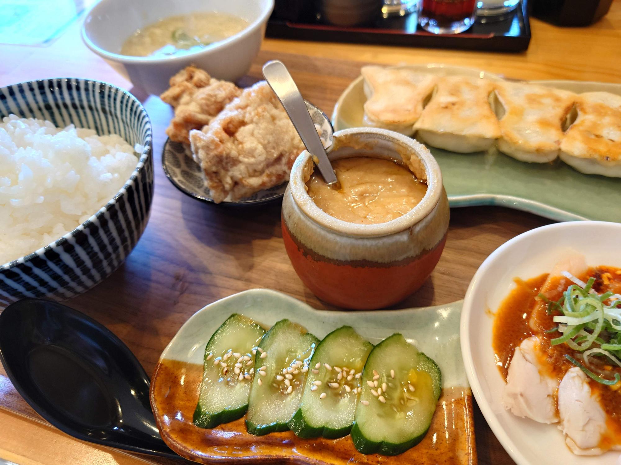 オーダーは、店主さんオススメのものにしました。ご飯に古墳王餃子5個と、とりの唐揚げ2個、選べるサイドメニューは「よだれ鶏」にしました。トレーの真ん中に置かれているのは自家製味噌ダレです。というのも、紬刃さんでは5種類の餃子の食べ方を指南しておられ、味噌ダレは、その一つです。