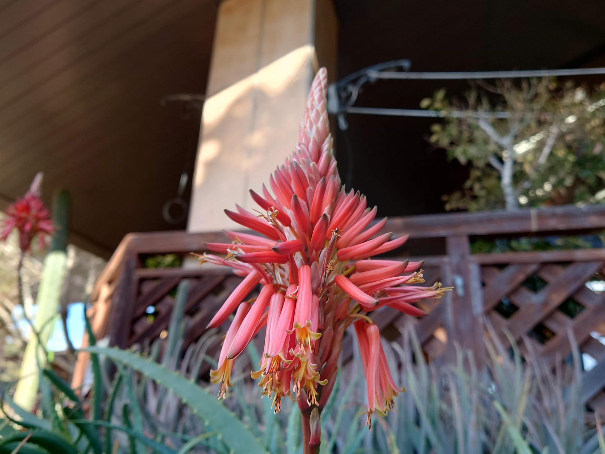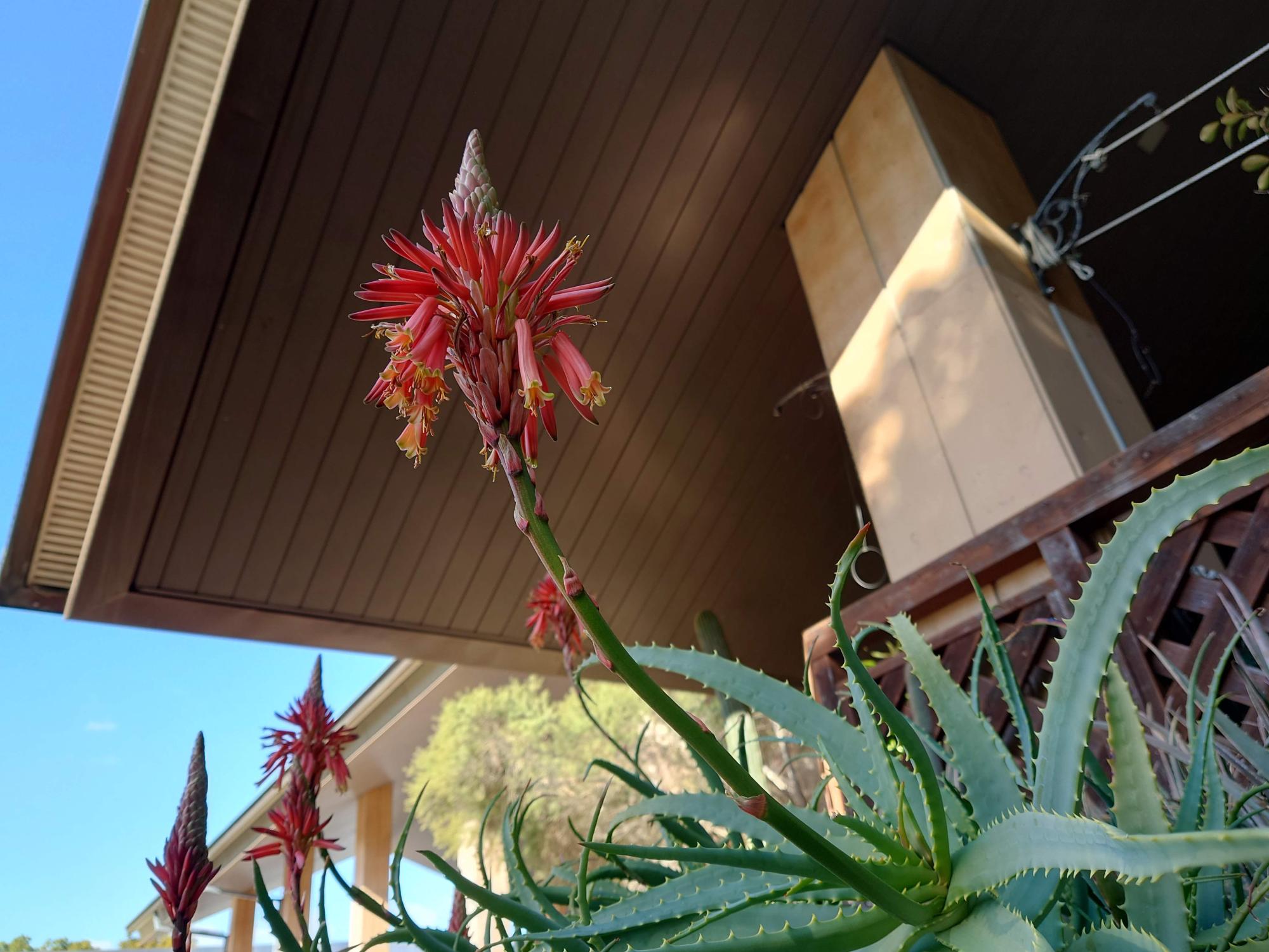 アロエの花、ご覧ください。お分かりになりますでしょうか? 下の部分はよく見るアロエの葉ですよね。そこからグンと上に伸びて、赤い房がたくさんぶら下がっているように見えるものがアロエの花です。