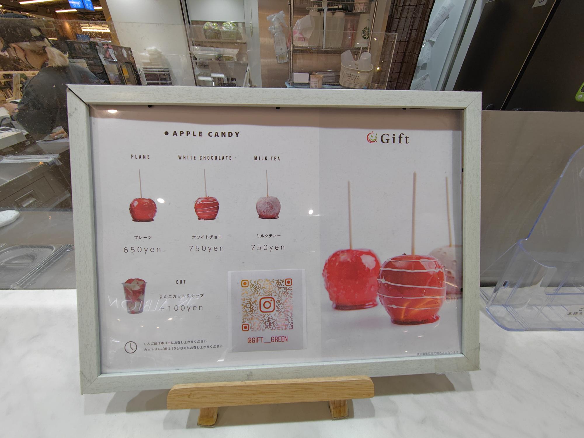「Gift」さんは、フルーツキャンディの専門店で、メニューには綺麗でかわいいりんご飴の写真が並んでいます。