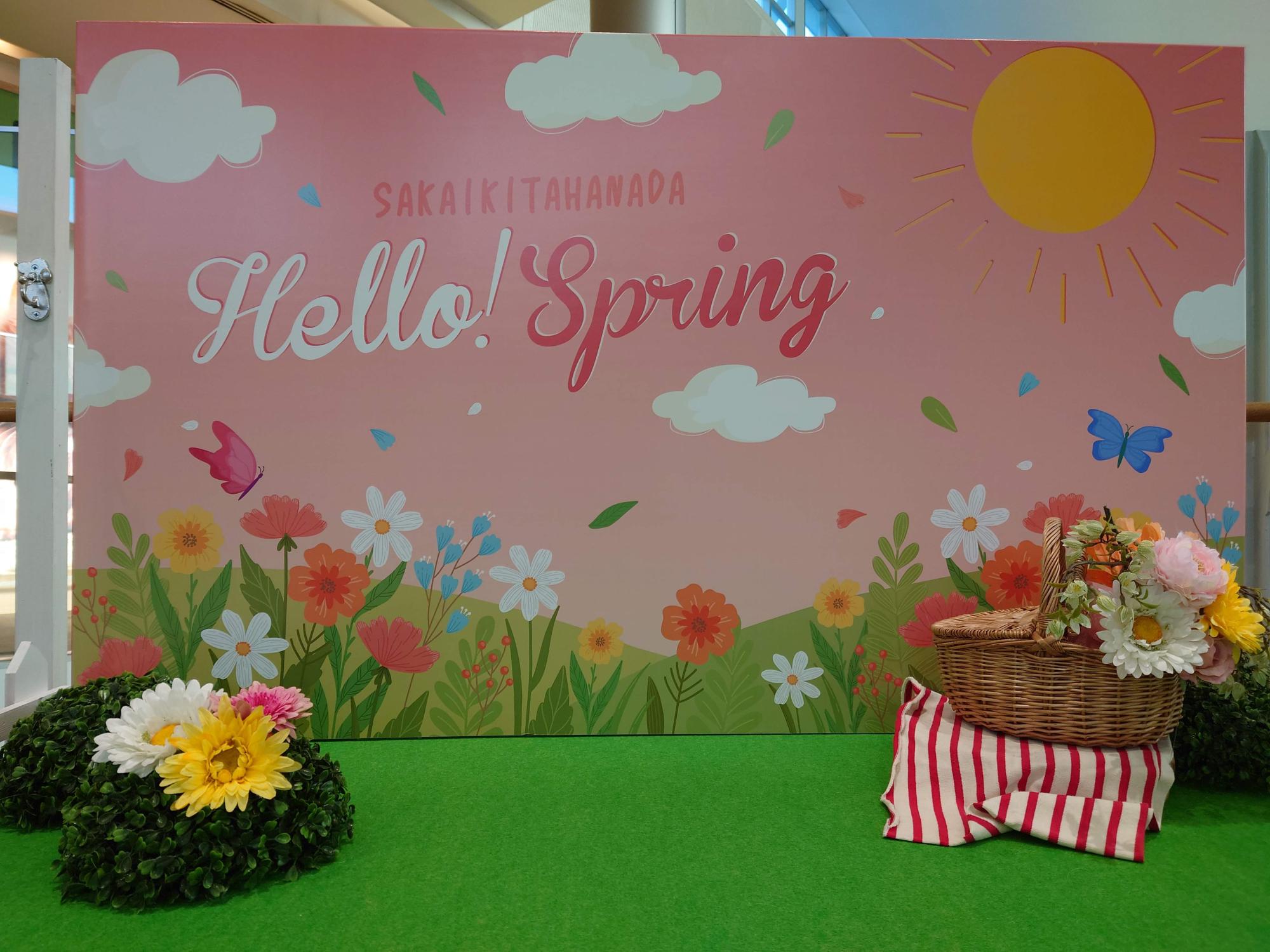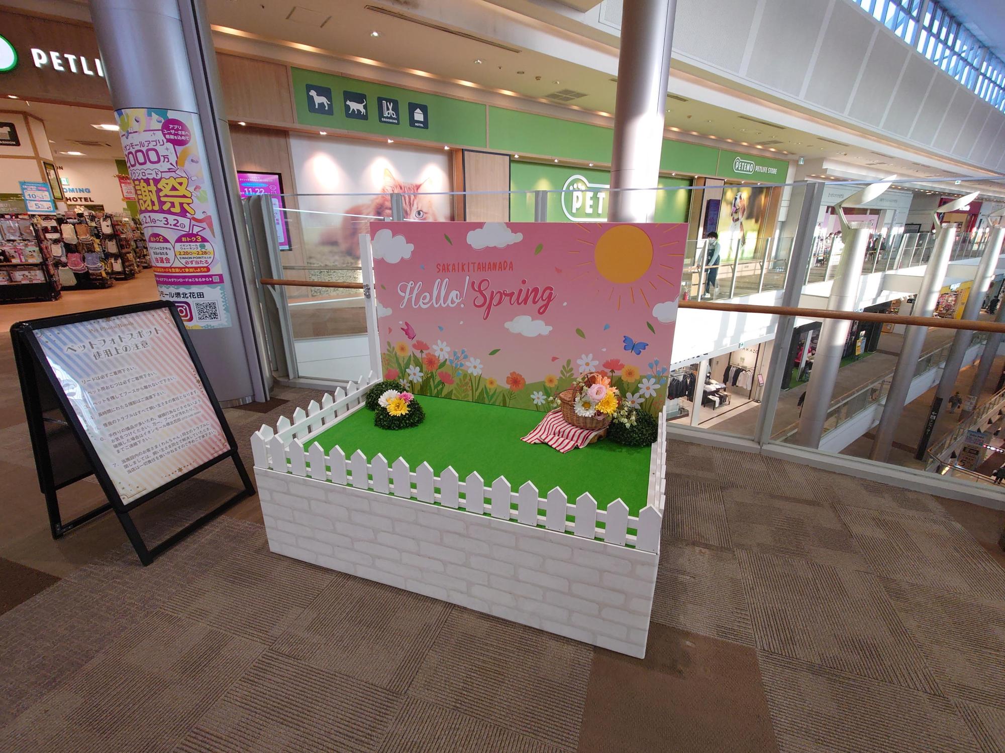 店舗に至る通路の床にワンちゃんのものと思しき足跡が点々とついているのも可愛い「PETEMO」は、イオンモール堺北花田4F北端にあります。「PETEMO」前にペットちゃんがより可愛く撮れるフォトスポットが登場してしばらく経ちますが、新年バージョンが1月末まで設置されていたのに変わり、春バージョンになっていました(2025年2月中旬撮影)。