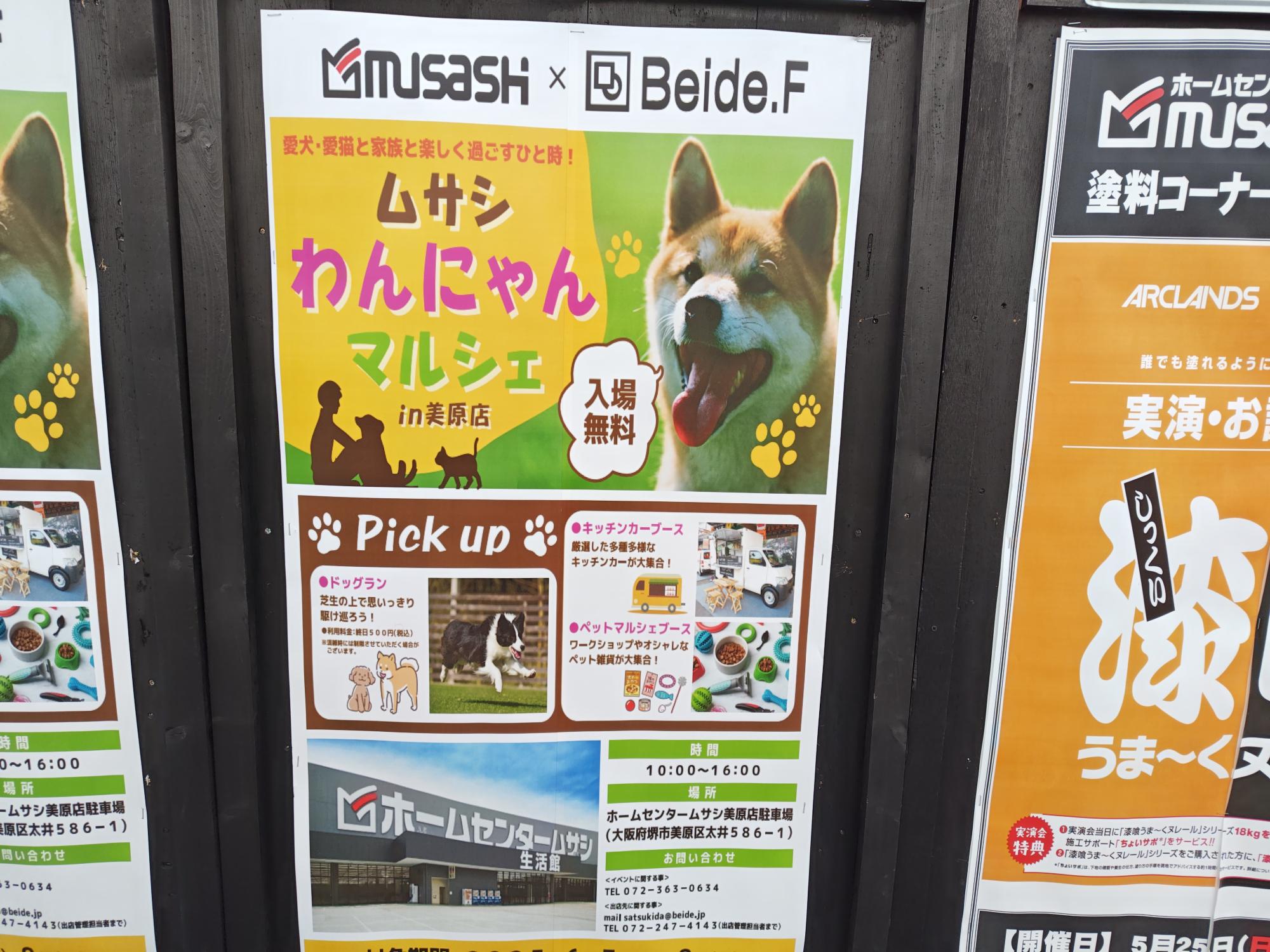 ポスターによると(2025年5月中旬撮影)、2025年6月7日(土)、8日(日)に「ムサシ わんにゃんマルシェ」が開催されるそうです。とても楽しそうなイベントで、入場無料。ドッグランでワンちゃんを遊ばせることもできて(利用料金・終日500円)、キッチンカーも来て、ペットマルシェブースでは、ワークショップやお洒落なペット雑貨が大集合だそうです。時間は10:00~16:00。愛犬ちゃんや愛猫ちゃんと一緒にご家族で楽しめますね。