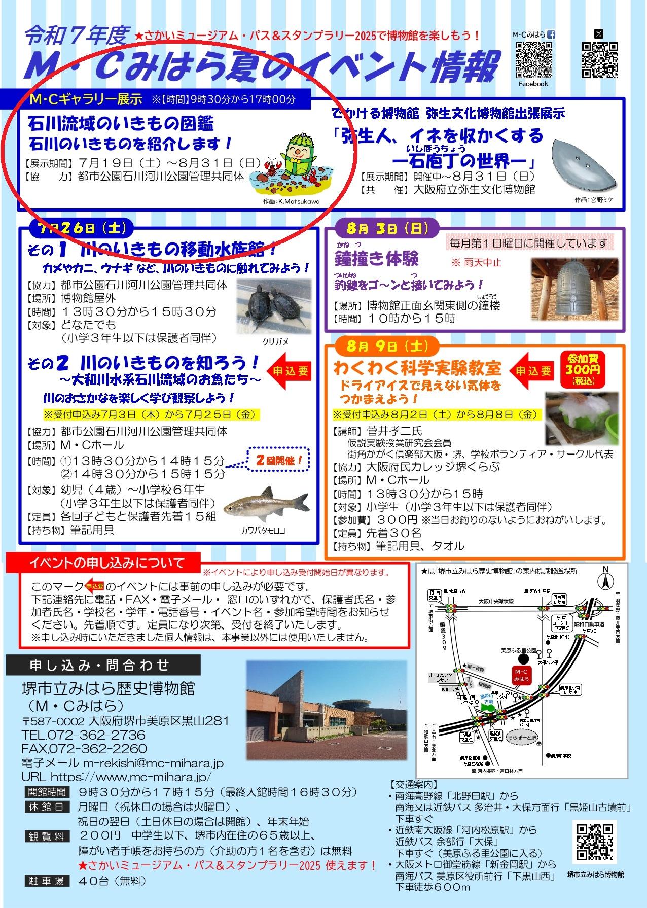 いろいろな講座やイベントなども行われていて、2025年7月19日(土)~8月31日(日)の日程で、「石川流域のいきもの図鑑」が開催されます。時間は9:30~17:00で、観覧料は無料です。