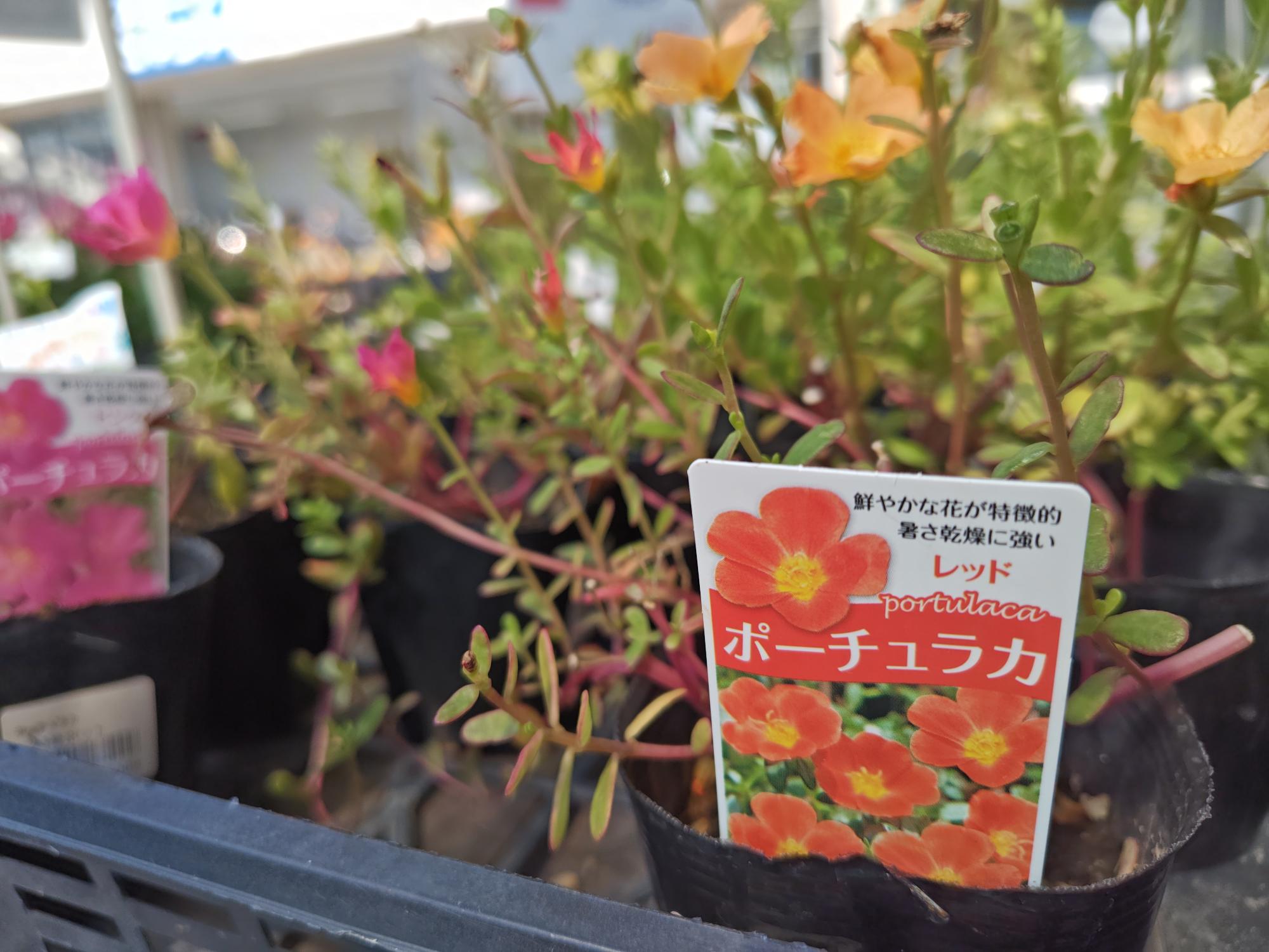 事業目的は、「人の心とまちにうるおいを与える花や緑を増やす」ことの実現を図ること。確かに、花や緑は人の心にいい効果がありそうですよね。「ポーチュラカ」・・・。どんな花なのか? ぜひとも現物を見てみたい。コーナンには花や緑のコーナーもあることを思い出し、早速探してみました。この暑い中、咲いているのかな? と、最初は暑さ・乾燥に強いことなどを知らなかったので不安でしたが・・・。