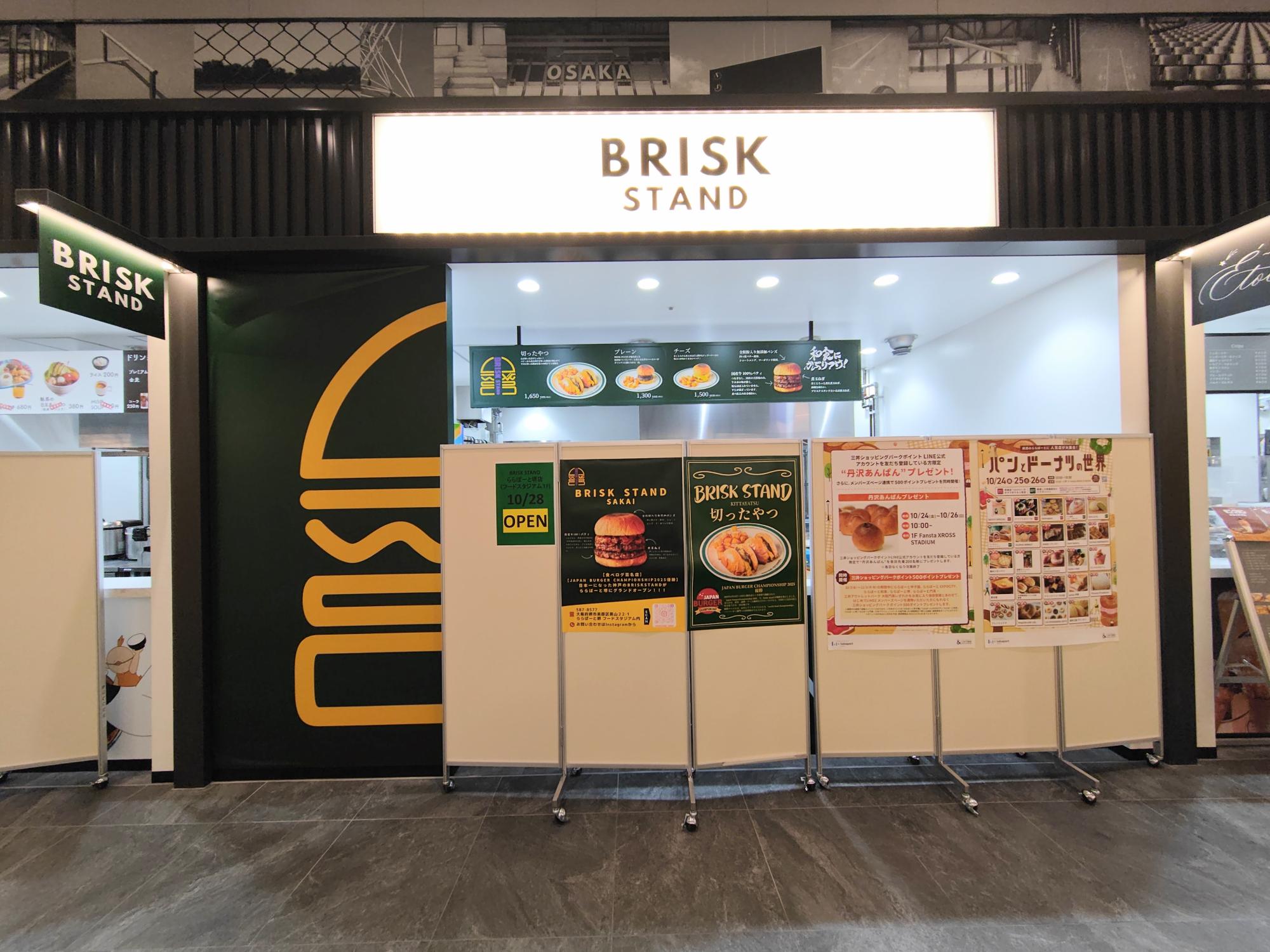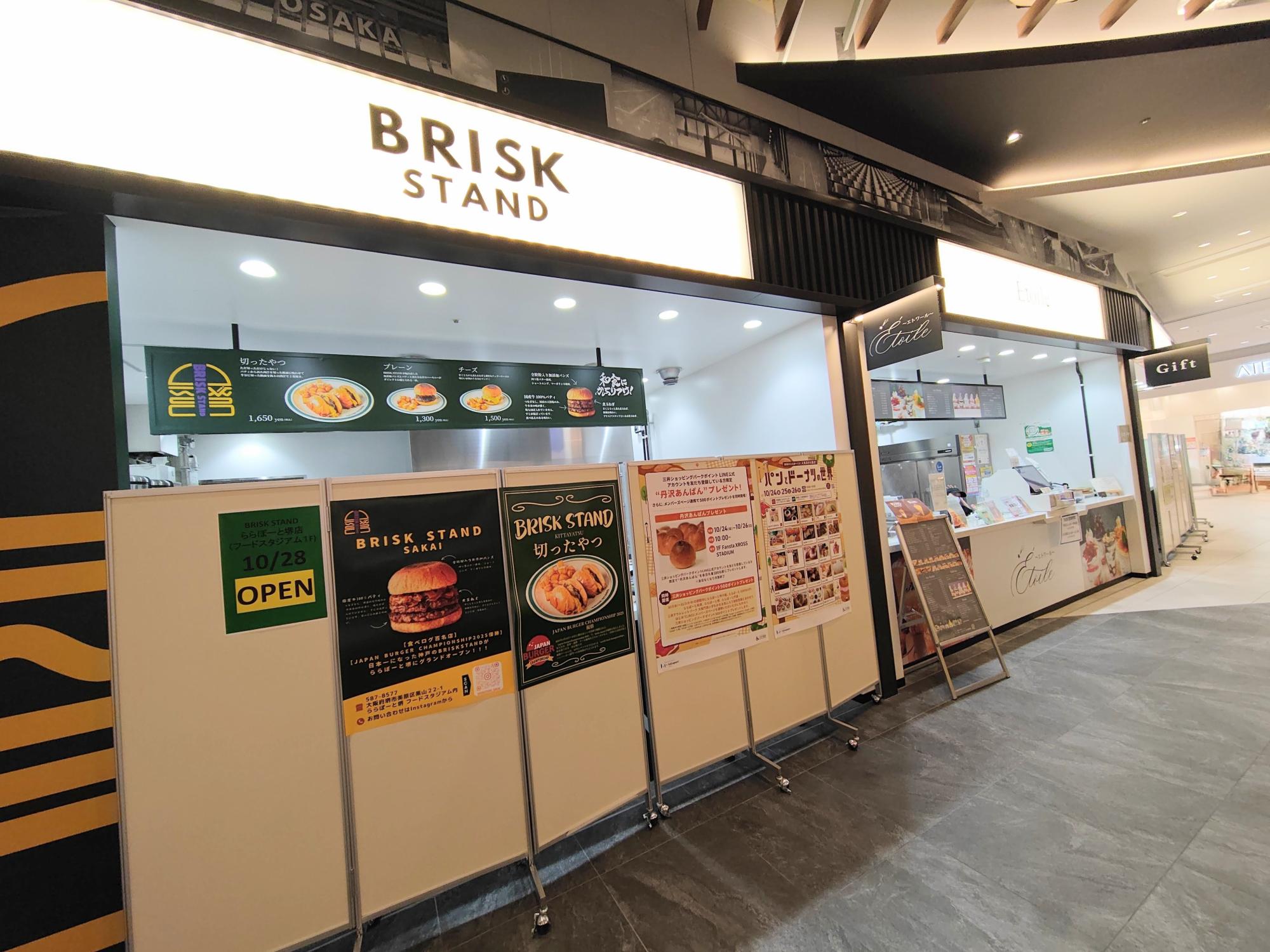 2025年10月28日(火)、「BRISK STAND」がオープンするのは、ららぽーと堺の1F中央、イベントスペース 「Fansta XROSS STADIUM」 沿いのフードスタジアムの一画です。「BRISK STAND」は、神戸に本店があり、なんと、食べログ百名店の一つでもあります。