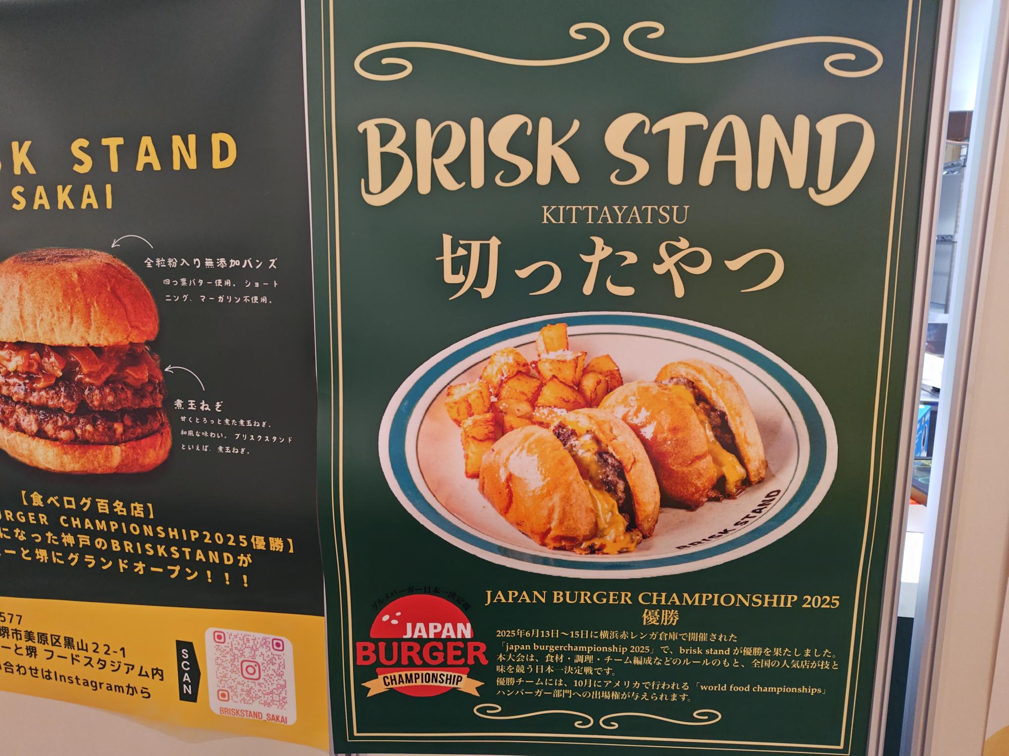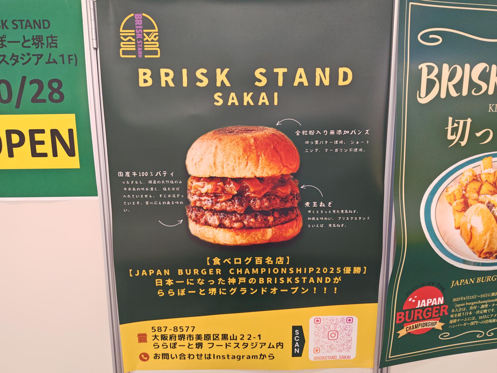 堺市美原区黒山の「三井ショッピングパーク ららぽーと堺」のフードスタジアム(フードコート)に、あのグルメバーガー日本一決定戦「バガチャン2025」で優勝したお店、「BRISK STAND」がオープンします!
